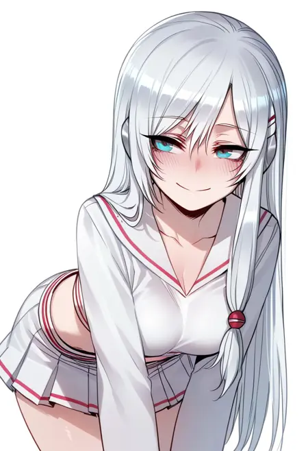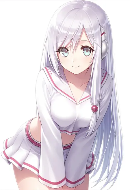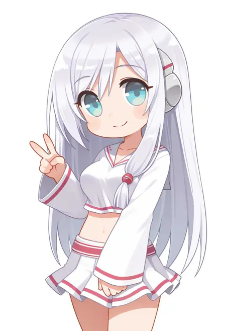 lucy,PIM-001, white hair, girl, blue eyes, robot, earphone ears, white clothes, crop top