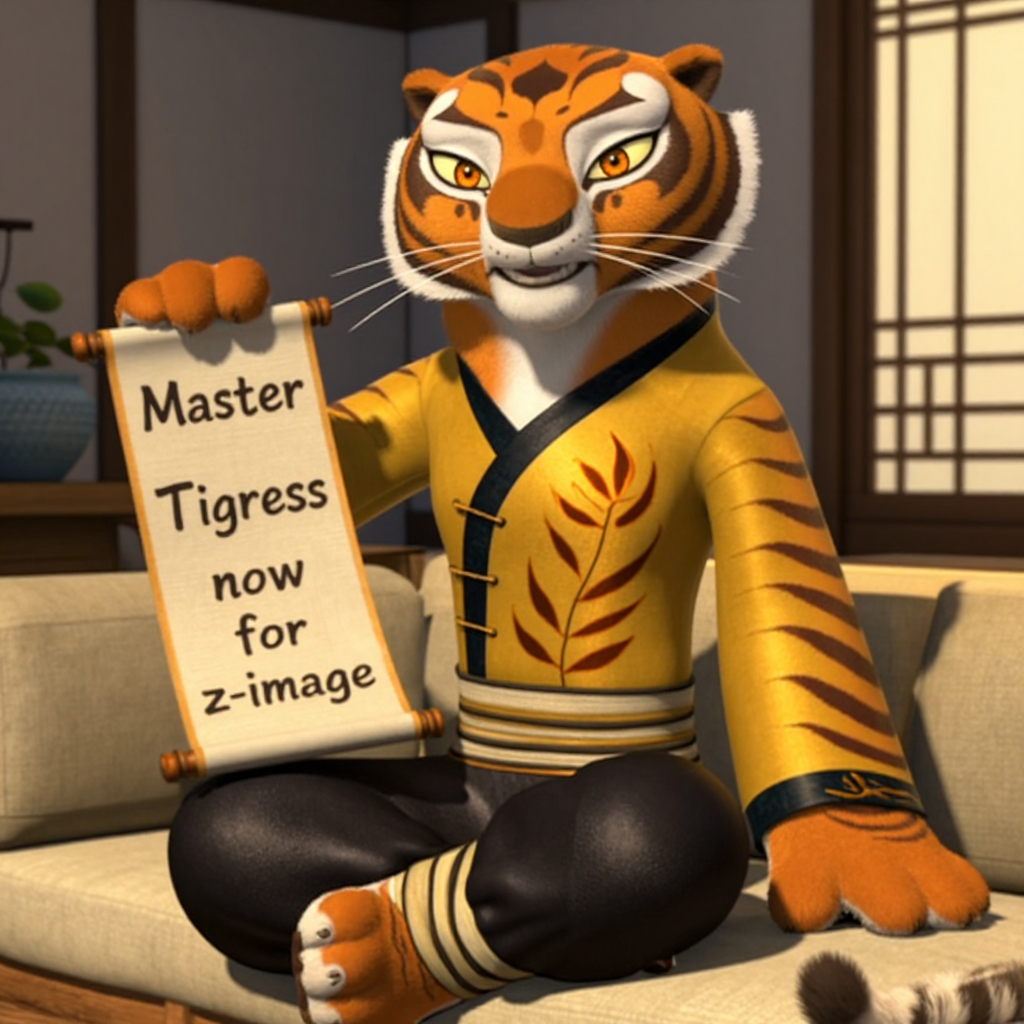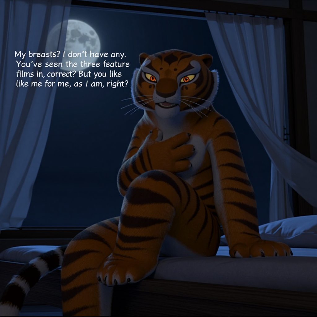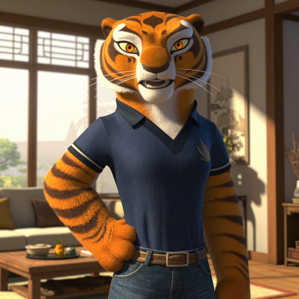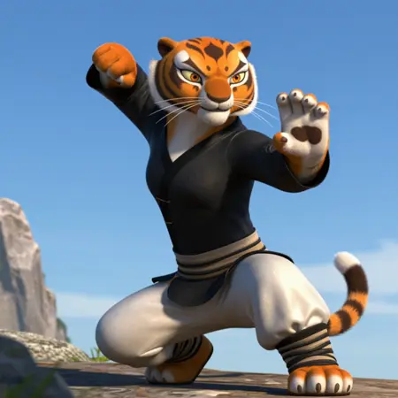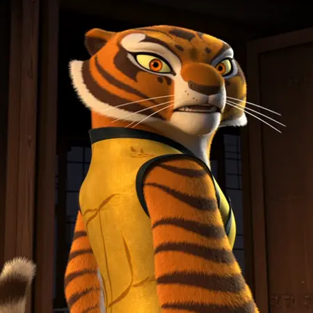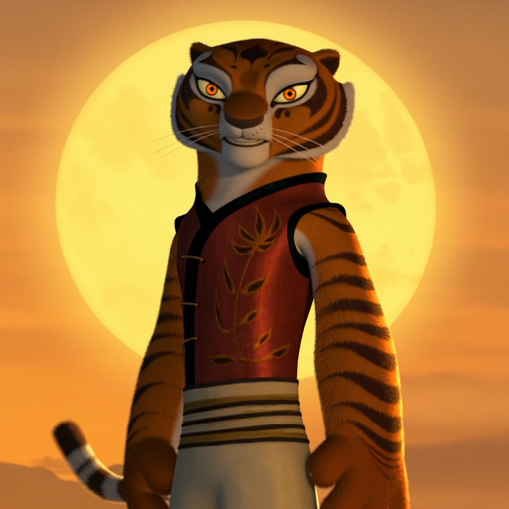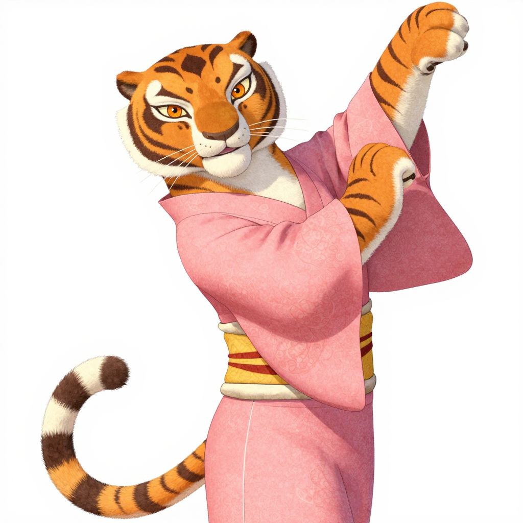 This Image features Tigress, a female anthromorphic tiger. She has orange and white striped fur. She is depicted wearing a sleeveless red qipao, ankle wrap, waist wrap and black silk pants. She has orange eyes and yellow sclera.