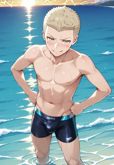 slim, blonde hair, short hair, shaved lines, freckles, mole under mouth, blush stickers, black pinstripe blazer, black pinstripe pants, white button up, black necktie, white dress shoes