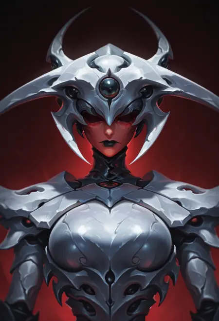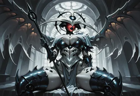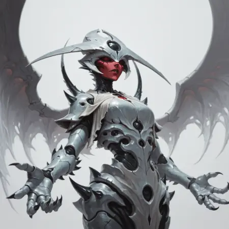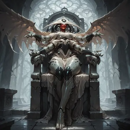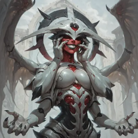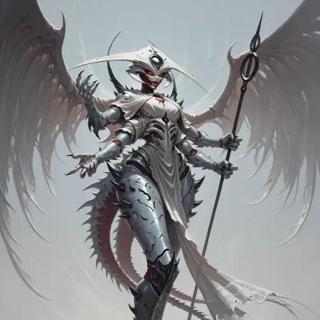tags: angel, monster, four arms, armored skin, headpiece, red face, extra arms, pale wings, phyrexian, two tails, holding spear, shoulder spikes, thigh spikes, waistcloth, sharp nails