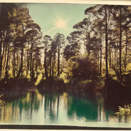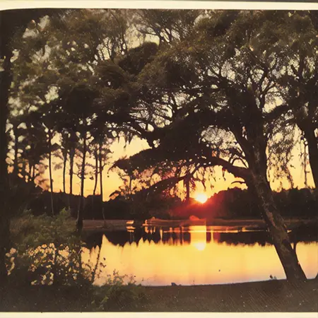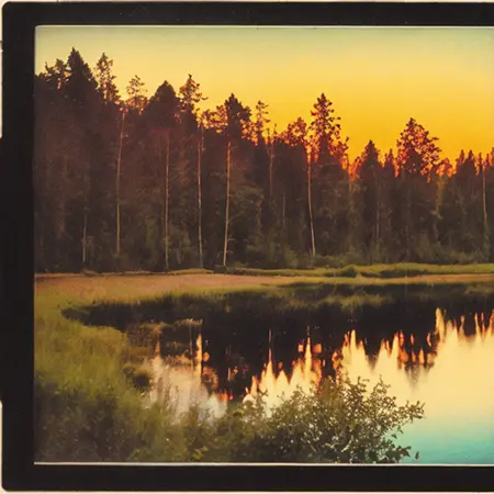 풀 뷰, 소나무 숲 속 작은 호수, 일몰