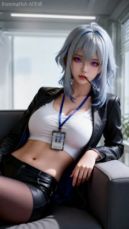 改变姿态,坐在高脚凳上,优雅地交叠双腿