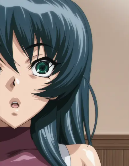 mai_ta1,mai_asagi_ta1,mature_female,black_hair,long_hair,green_eyes,large_breasts,purple_bodysuit,bare_shoulders,holding_sword