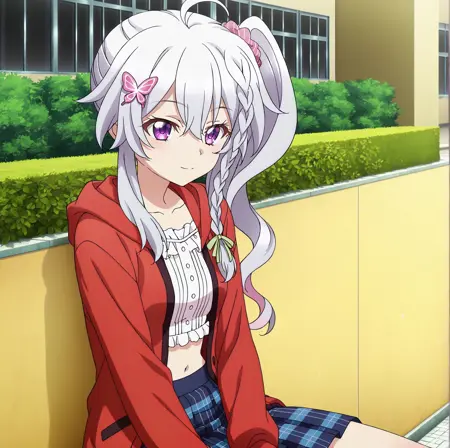 NiimiSora_9RC, 흰 머리카락, 긴 머리카락, 앞머리, 눈 사이의 머리카락, ahoge, 보라색 눈,