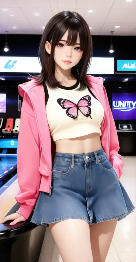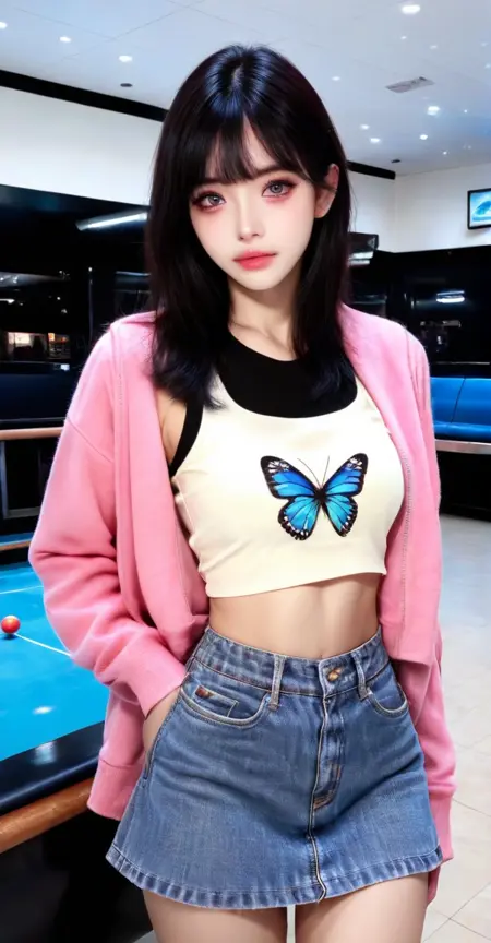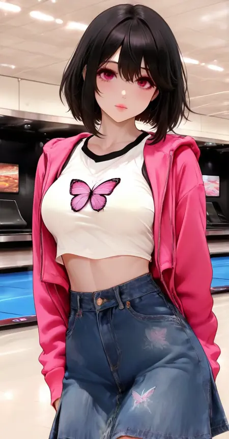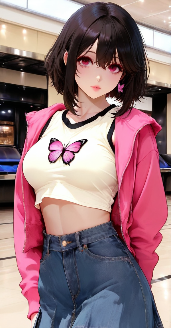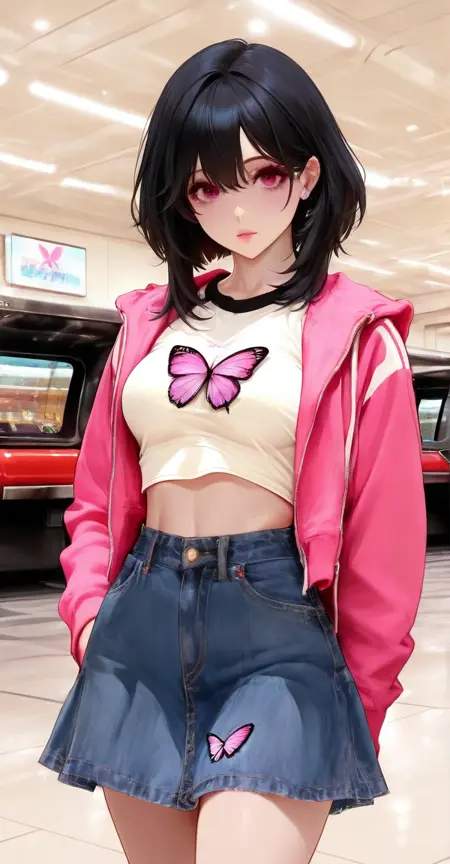 xg1, pink jacket, butterfly print, butterfly print shirt, midriff, crop top,demin skirt, denim