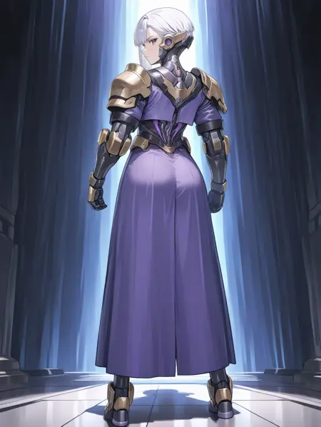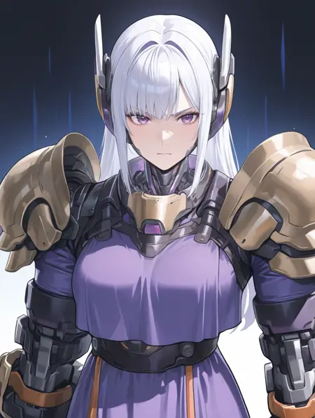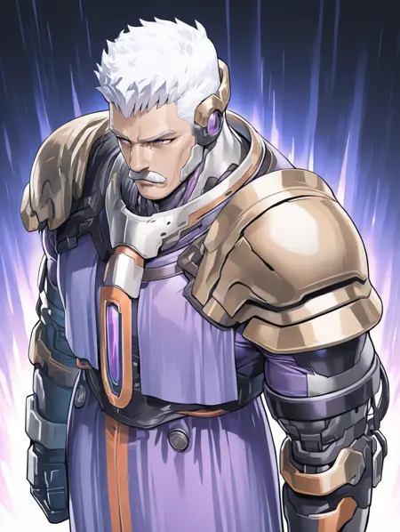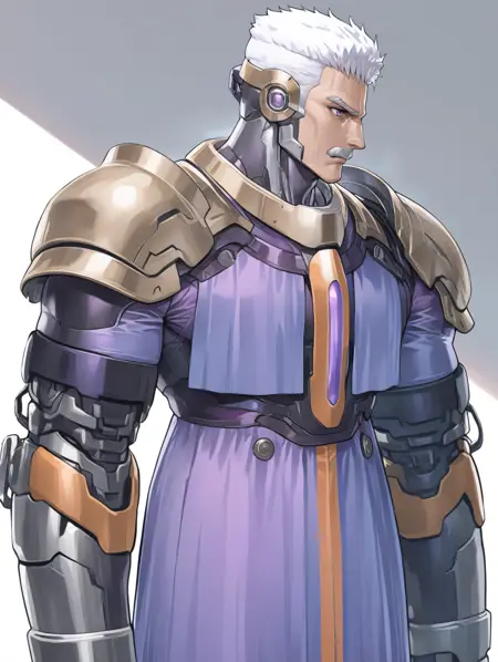提示示例:hanieru,白发,头饰,紫眼,军装,肩甲,赛博格,紫色长袍,阳刚,严肃,胡子,