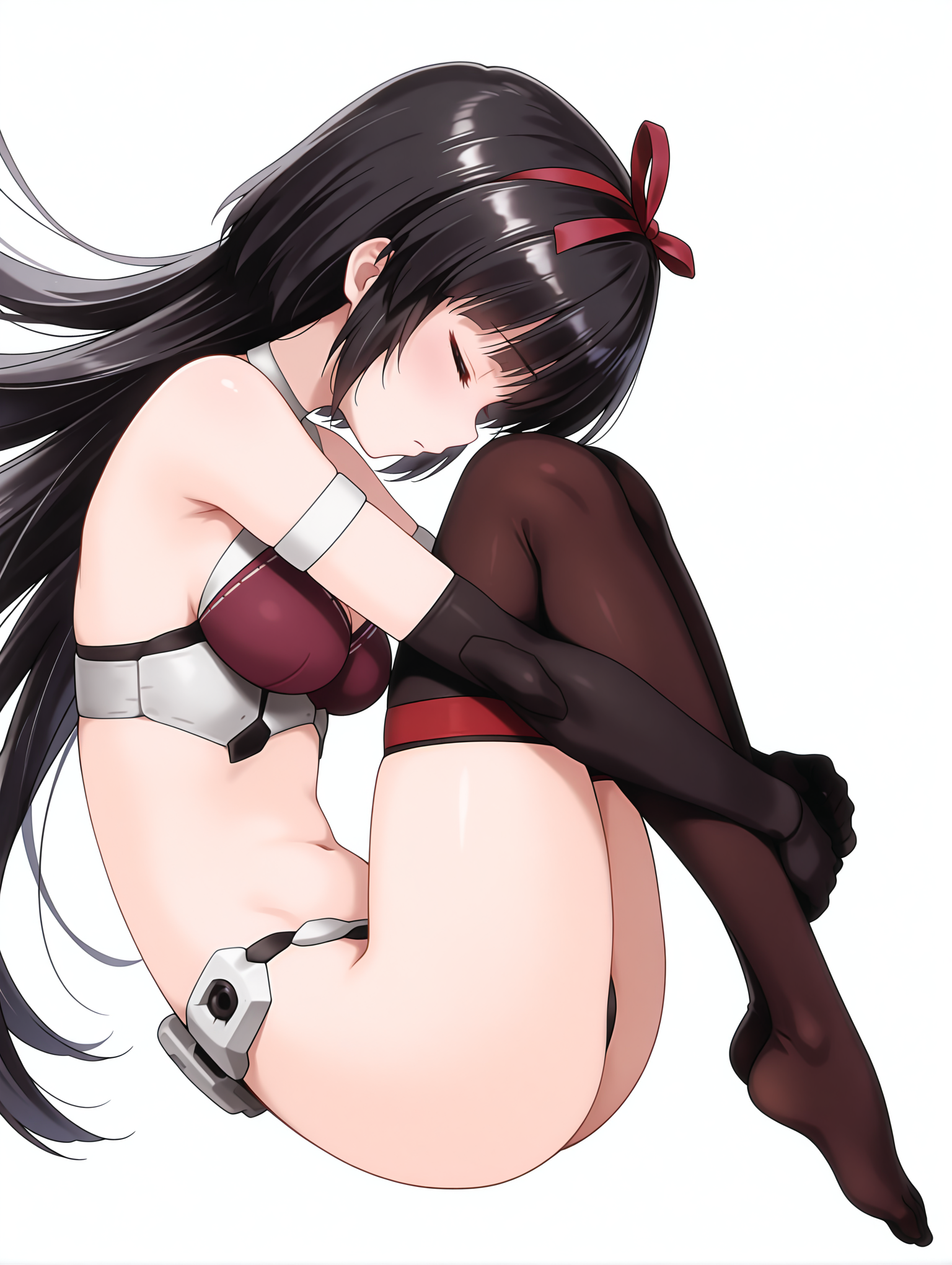 服装:m_inner, 黑色露背装, 短上衣, 黑色肘套, 无肩带下装, 黑色胯部护板, 过膝长筒袜, 无鞋,