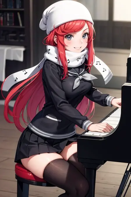 她正常造型的描述为:“校服、毛线帽、过膝袜、围巾、裙子、音符图案”