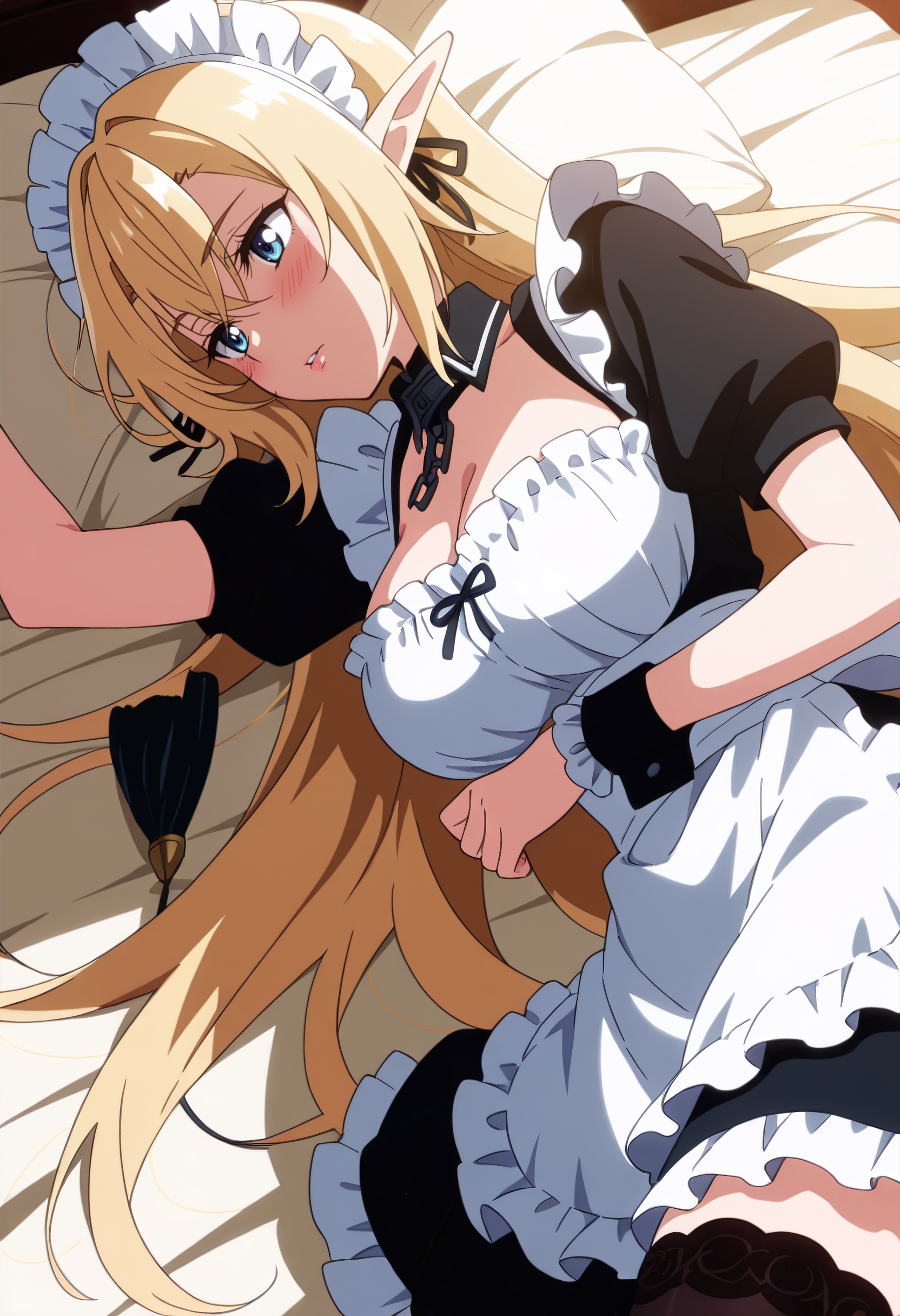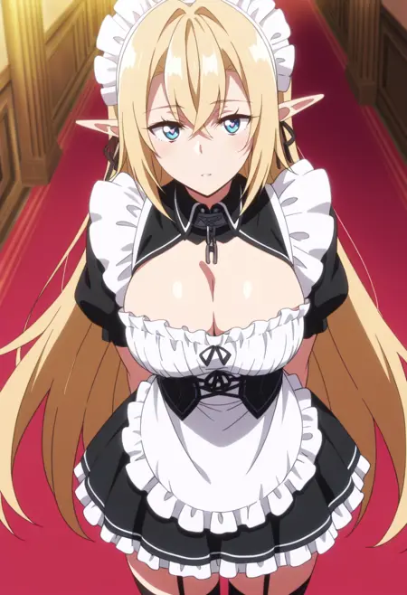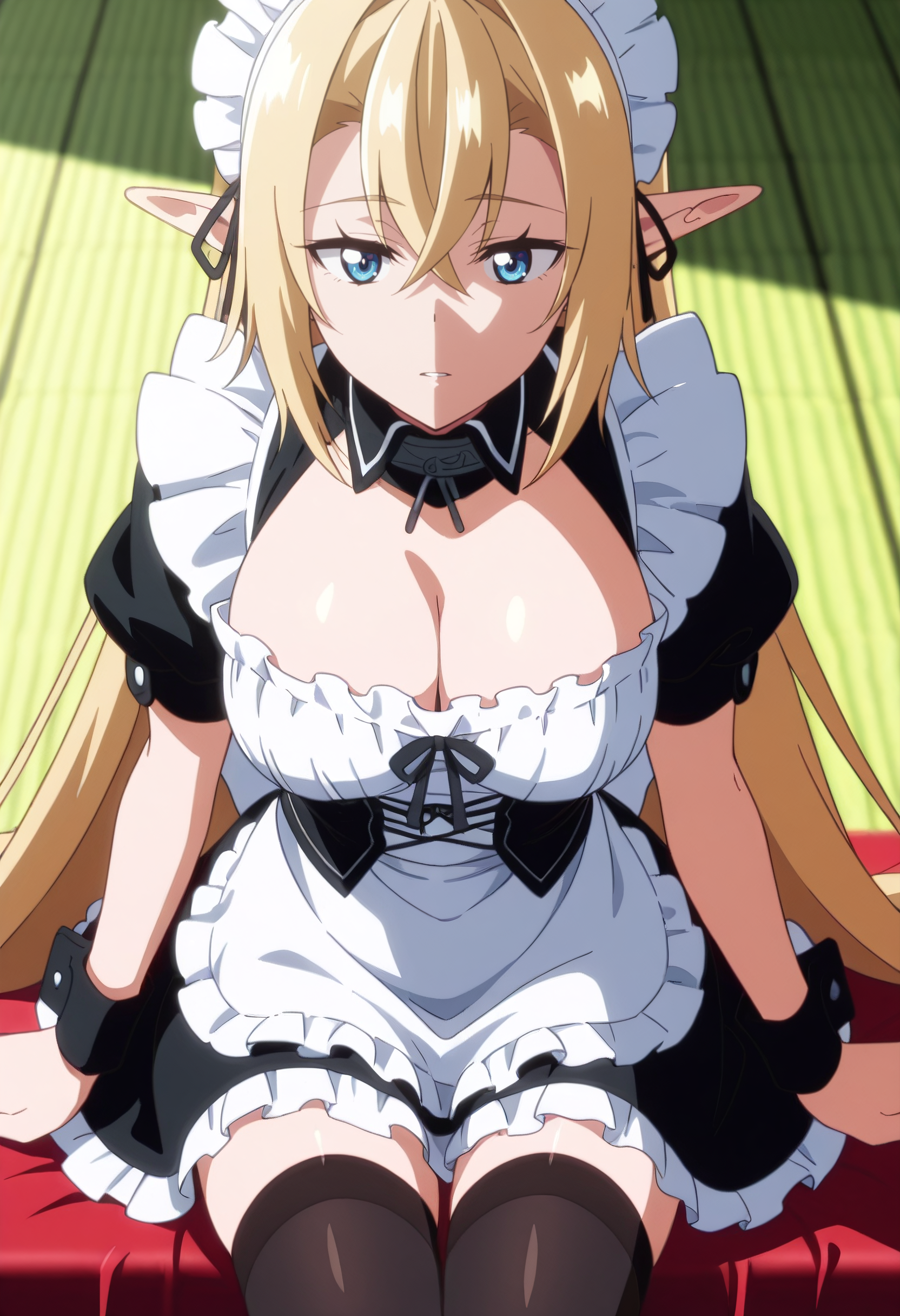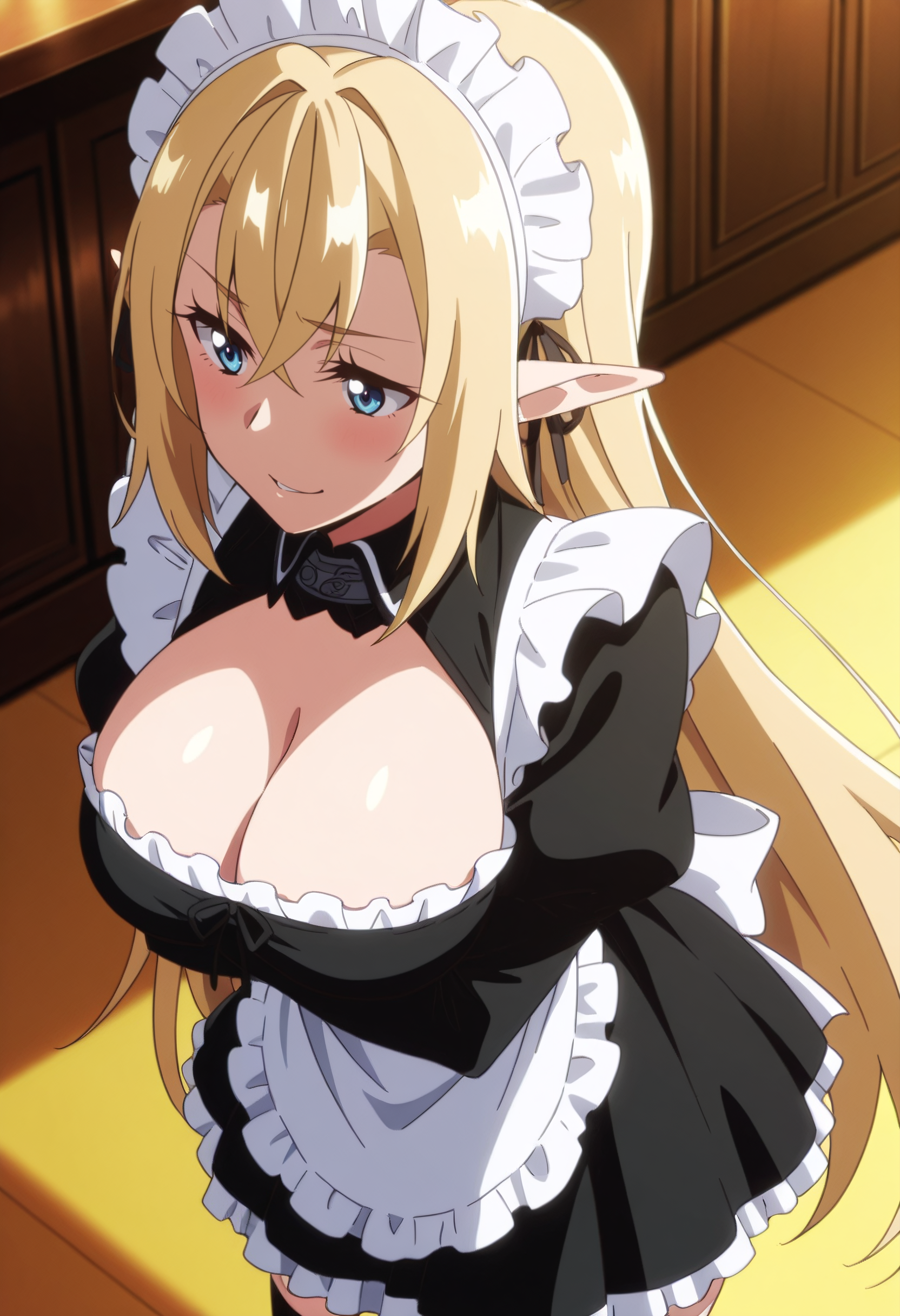 엘프, 메이드 헤드기어, 메이드, 메이드 복장, 앞치마, 메이드 앞치마, 리본, 흰색 앞치마, 칼라, 가슴 노출, 프릴, 검은 리본, 풍성한 소매, 허벅지까지 오는 양말, 검은 하의,
