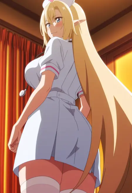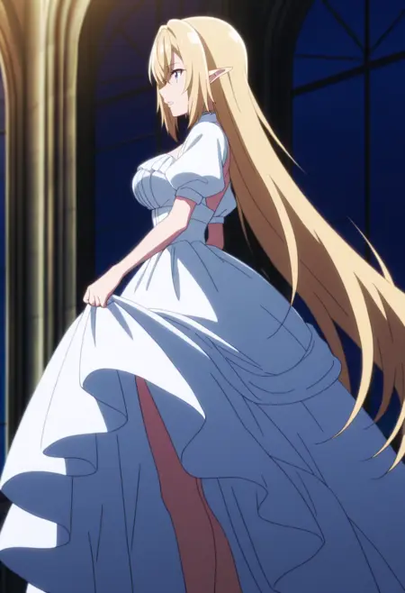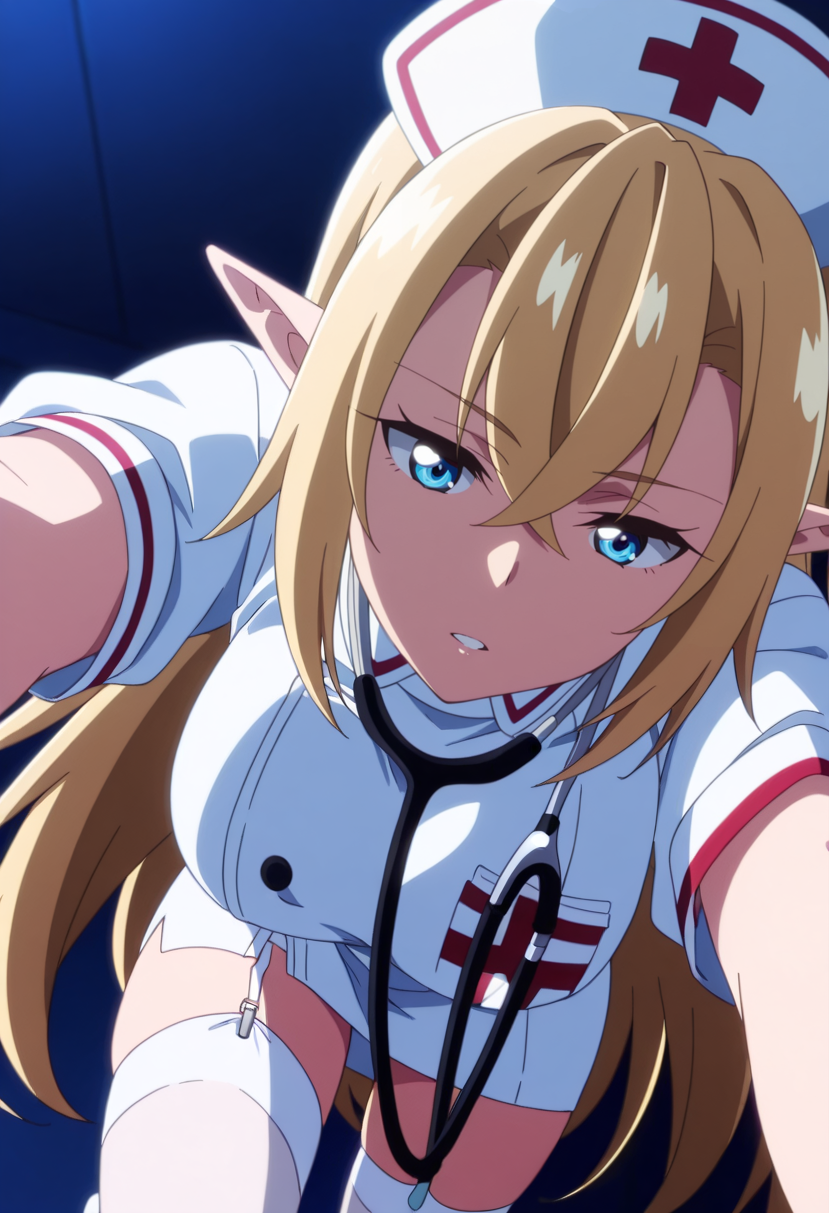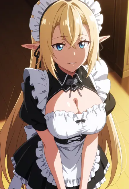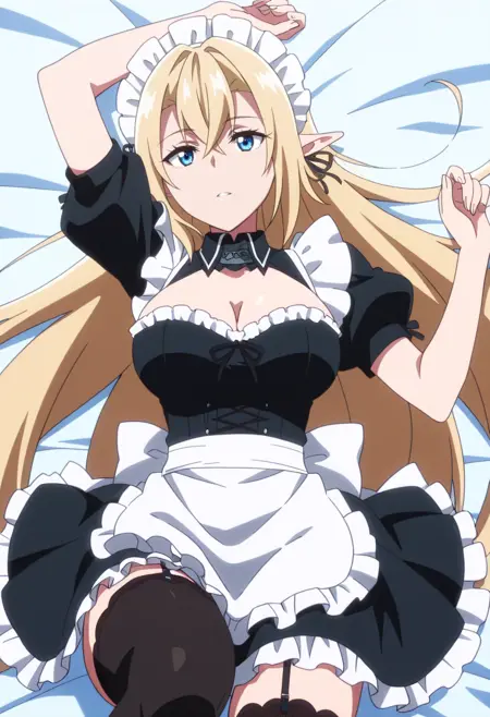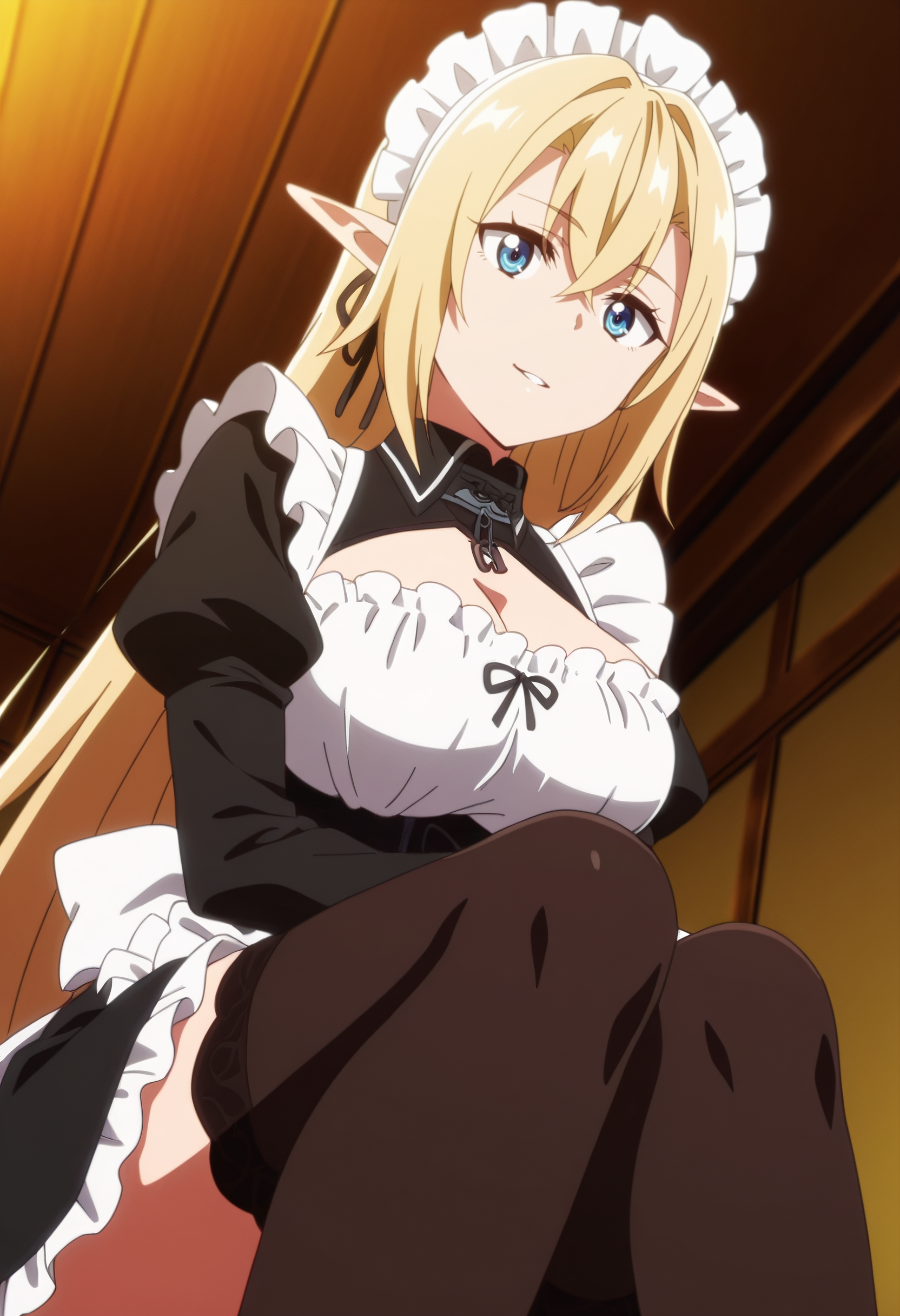 엘프, 메이드 헤드기어, 메이드, 메이드 복장, 앞치마, 메이드 앞치마, 리본, 흰색 앞치마, 칼라, 가슴 노출, 프릴, 검은 리본, 풍성한 소매, 허벅지까지 오는 양말, 검은 하의,
