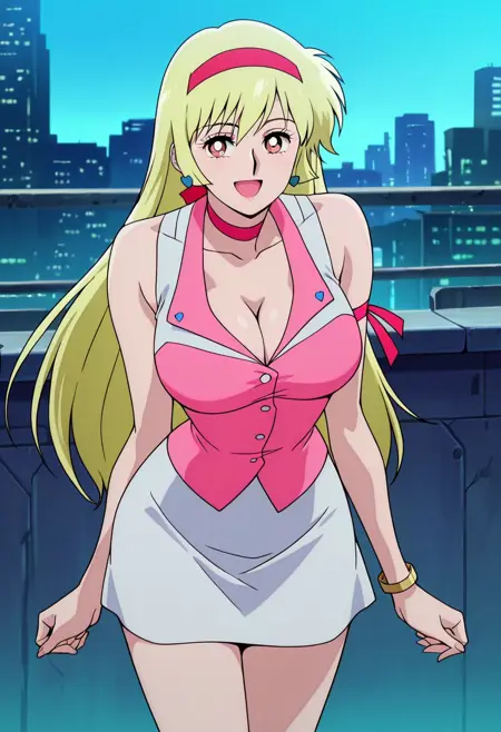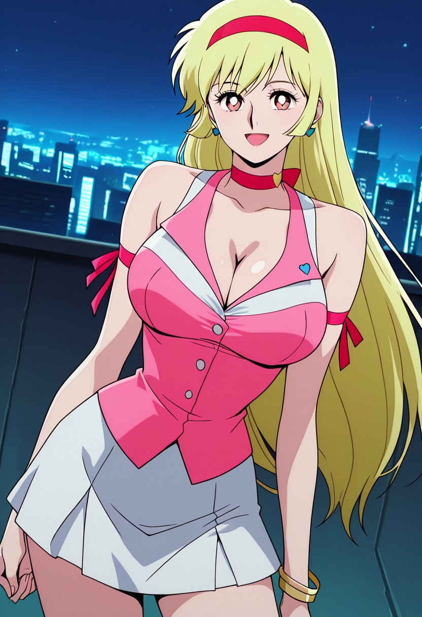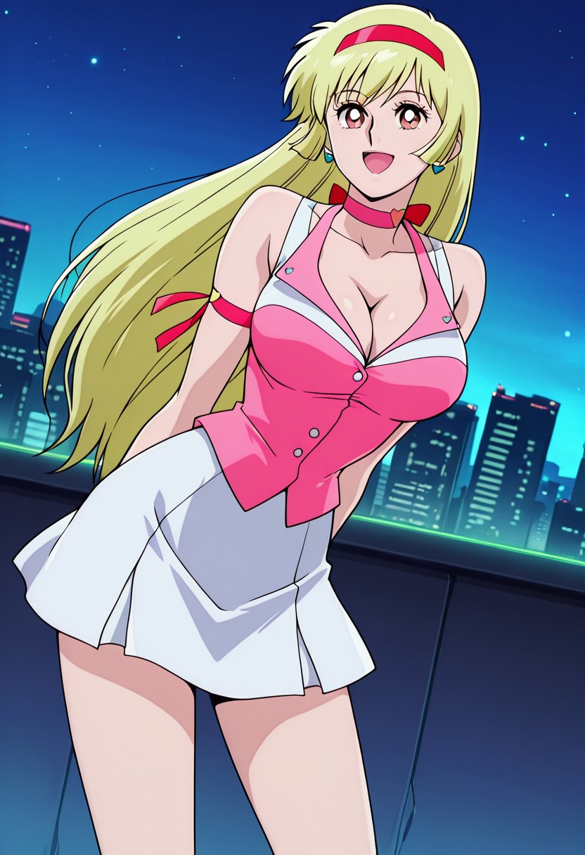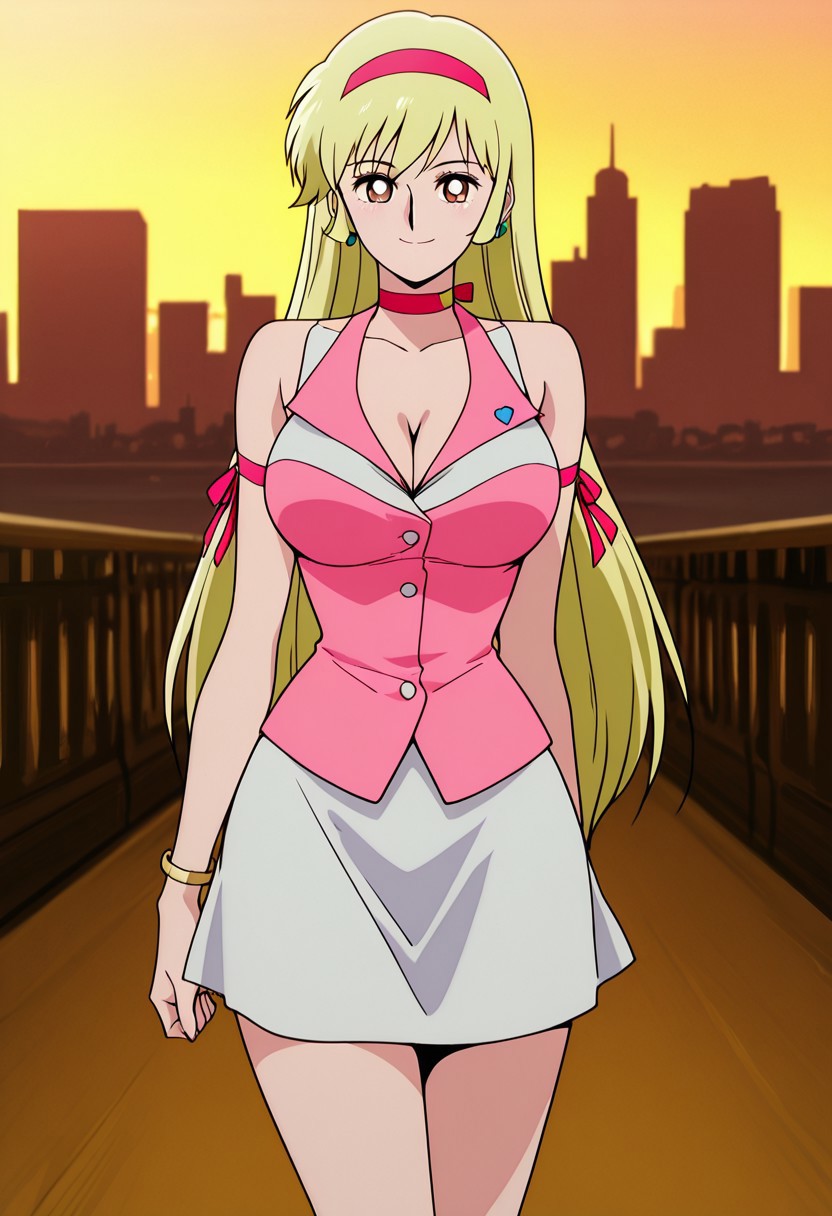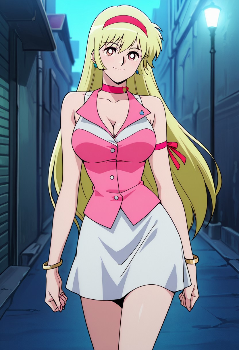 casual outfit, pink shirt, cleavage, sleeveless, white skirt, short skirt, pink boots, two gold bracelets, red headband, blue earrings, pink choker, pink arm ribbon, blue heart symbol,