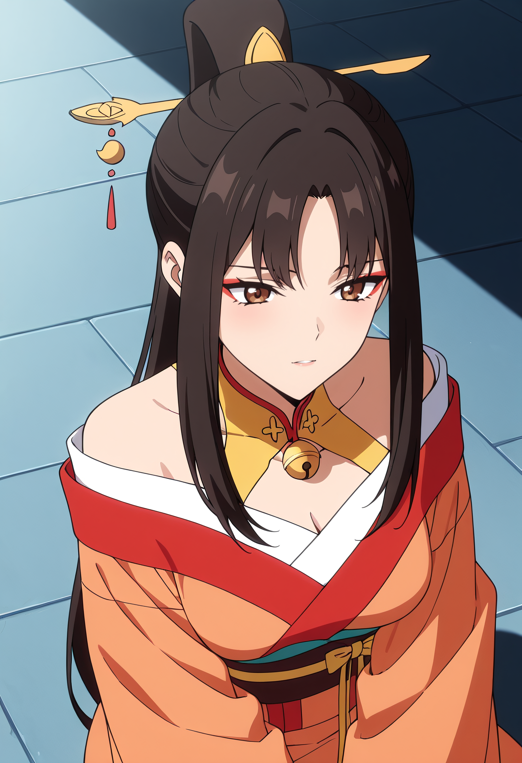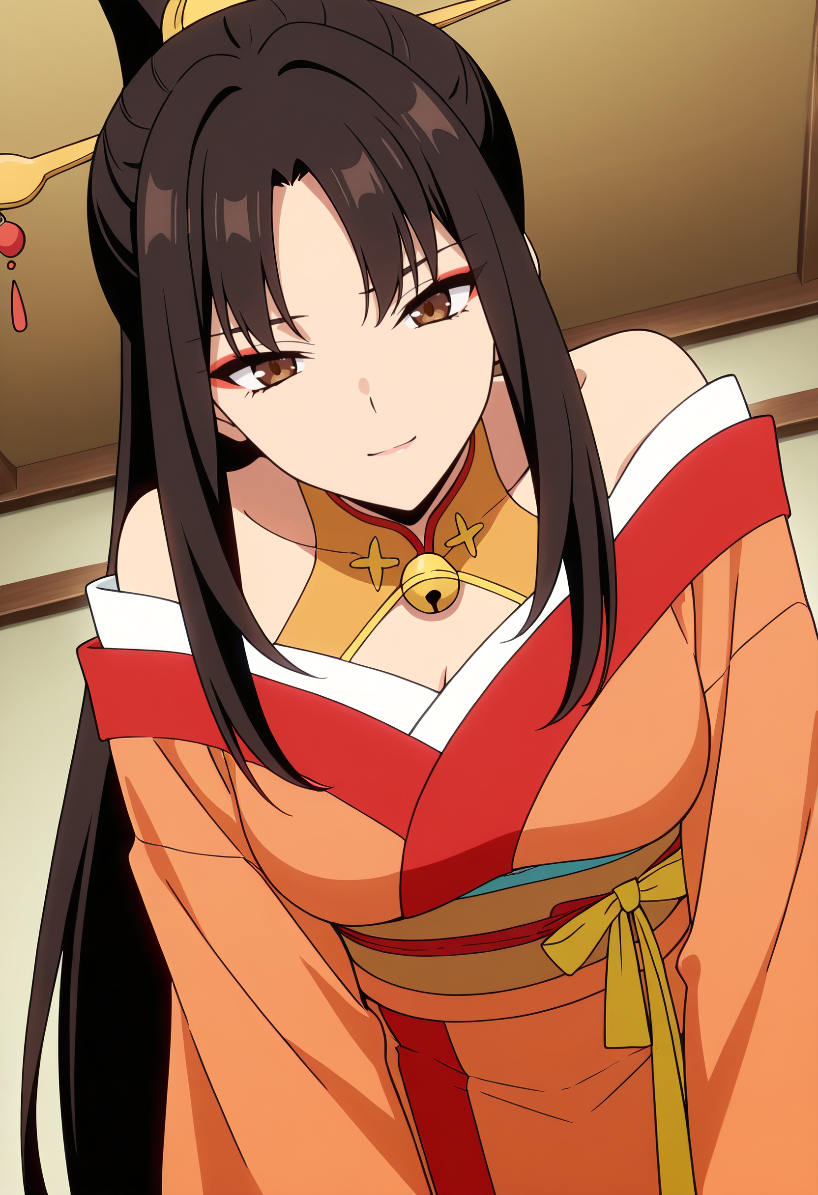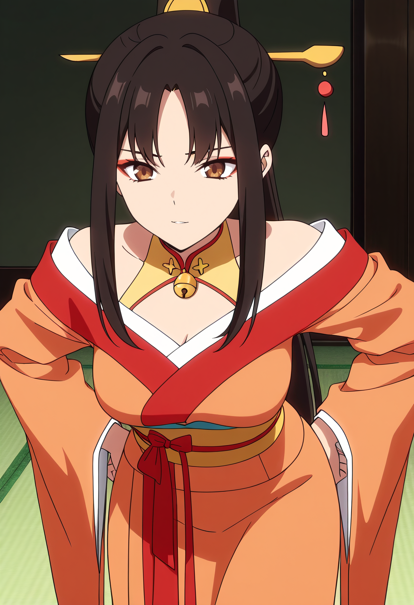 日本の服、着物、髪飾り、リボン、広い袖、肩出し、長袖、肩出し、黄色いリボン、中国の服、チョーカー、鎖骨、鈴、髪リボン、帯、サッシュ、