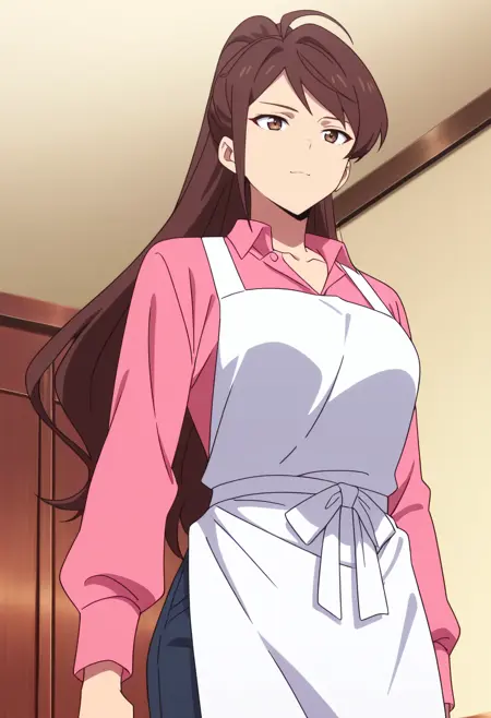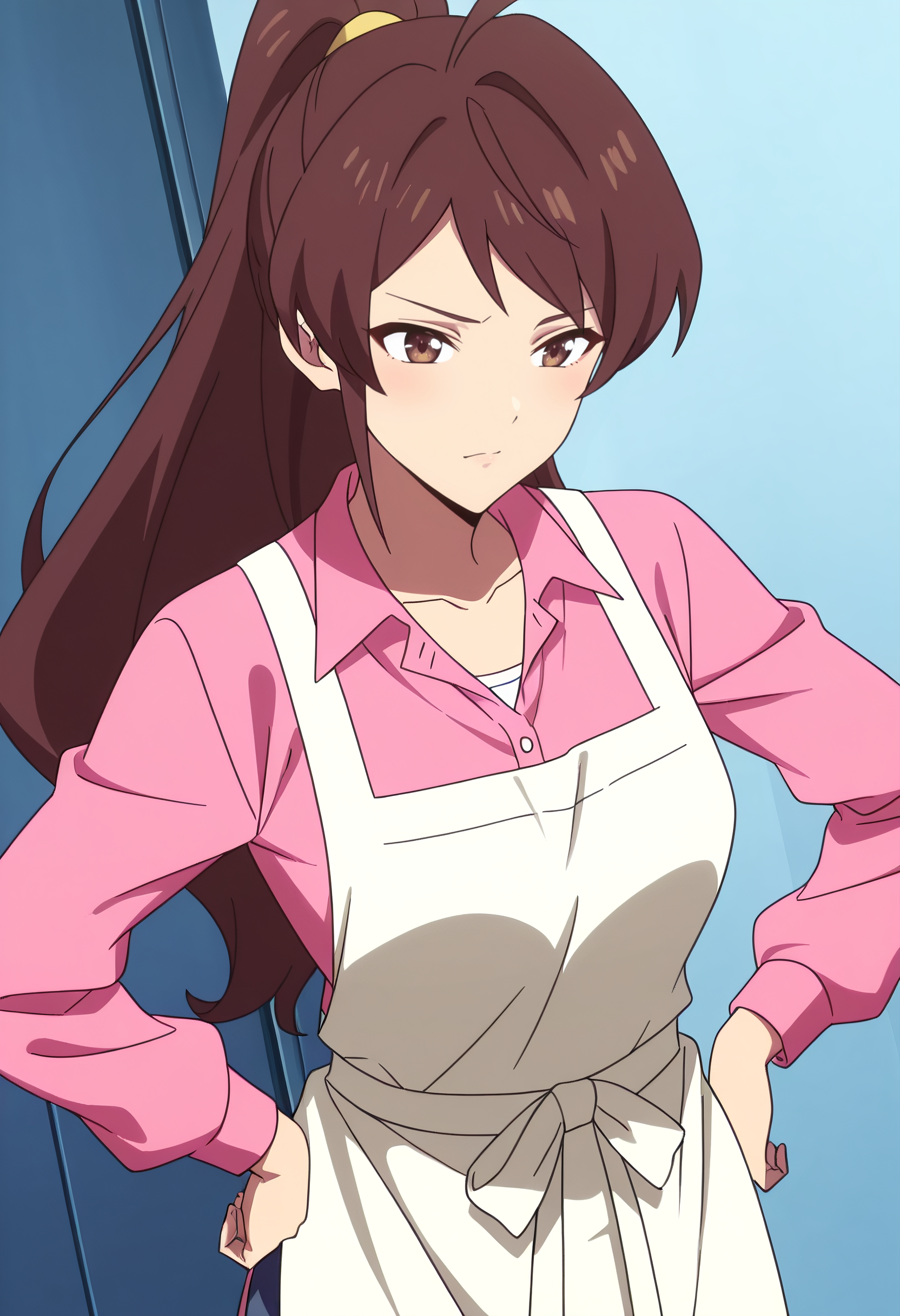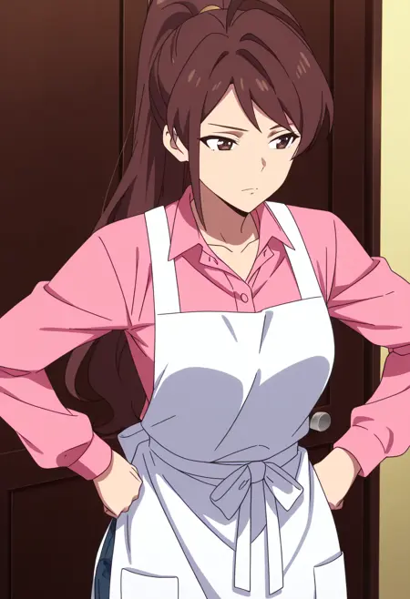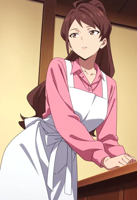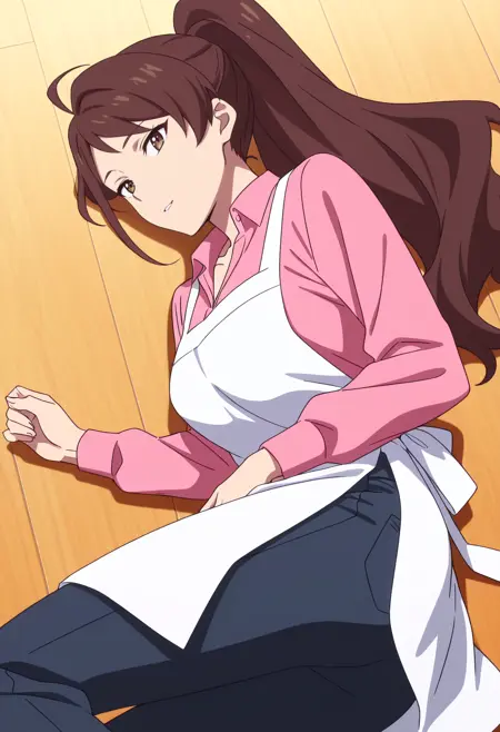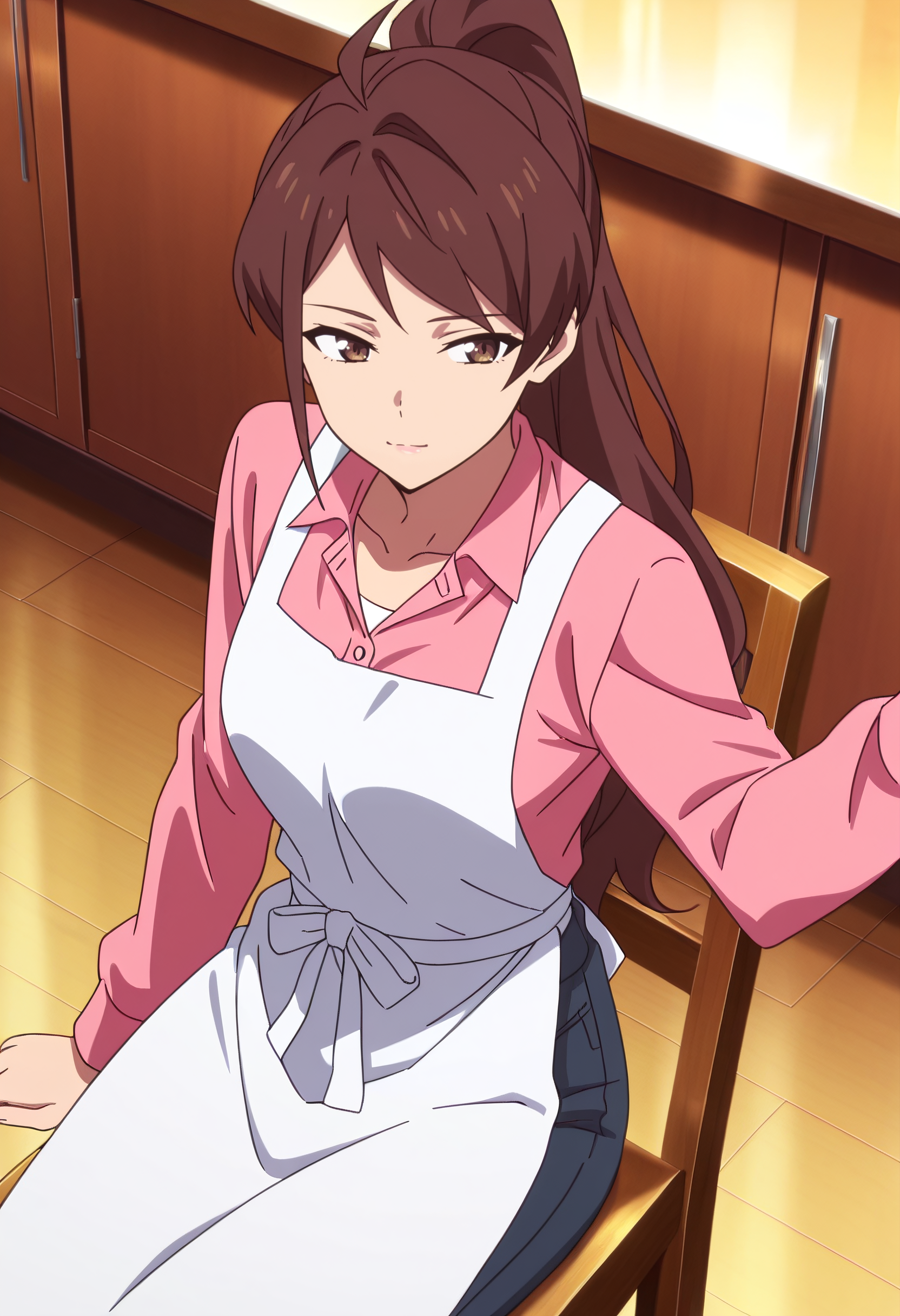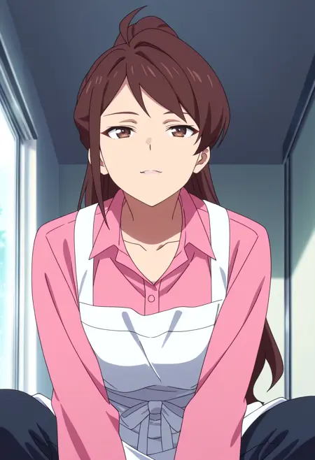 WangMotherApron, 셔츠, 분홍색 셔츠, 긴 소매, 앞치마, 클라비컬, 칼라 셔츠, 아호게, 바지, 흰색 앞치마, 리본,