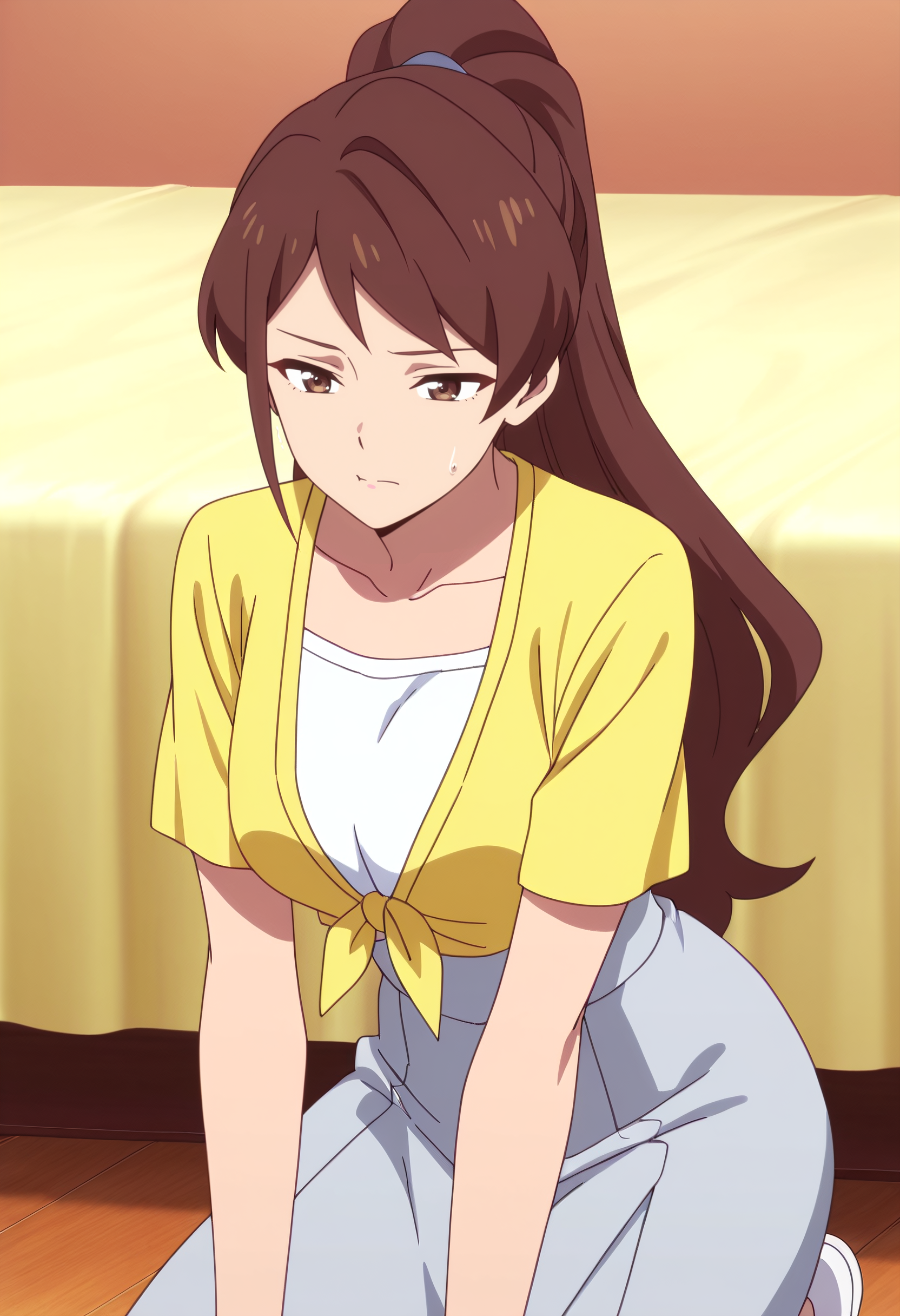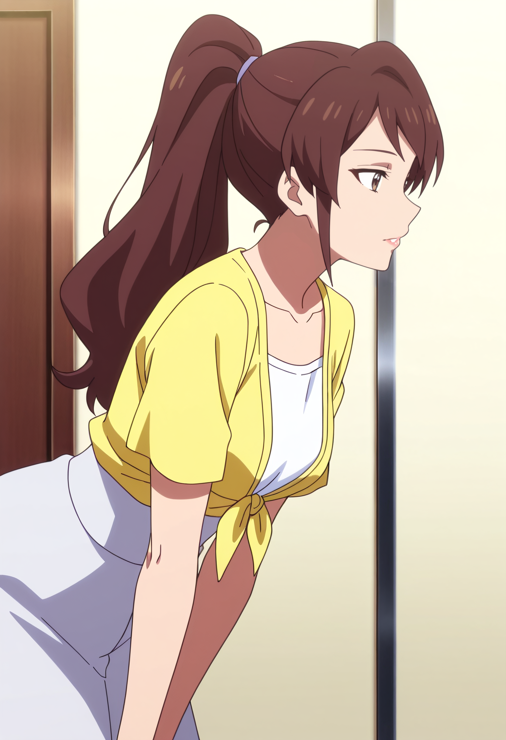 WangMotherShirt, 클라비컬, 셔츠, 노란색 셔츠, 짧은 소매, 흰색 셔츠, 치마, 벌어진 옷, 앞쪽 매듭 상의,