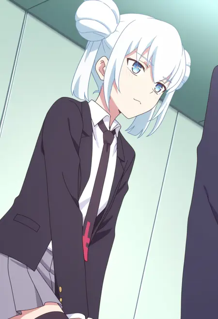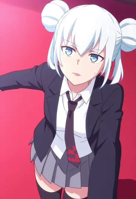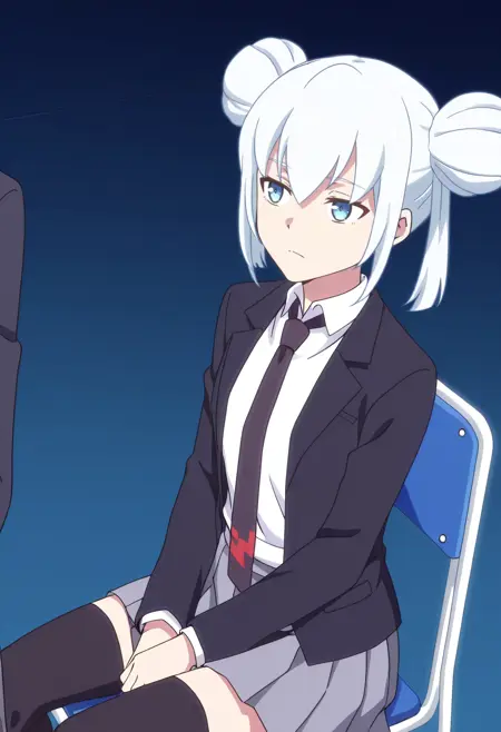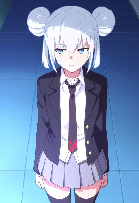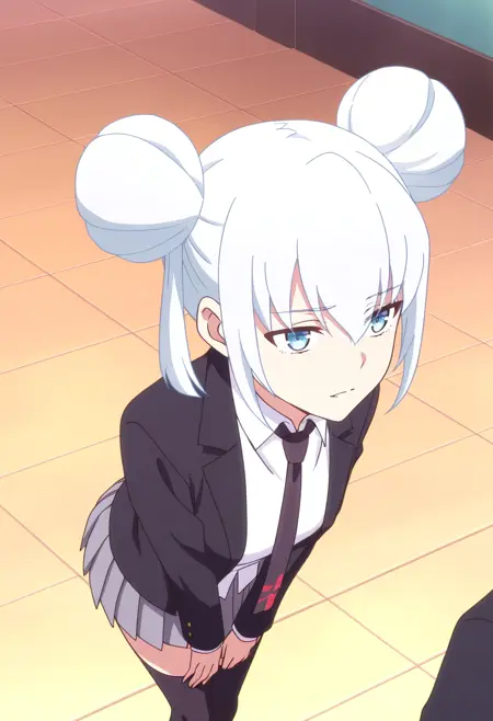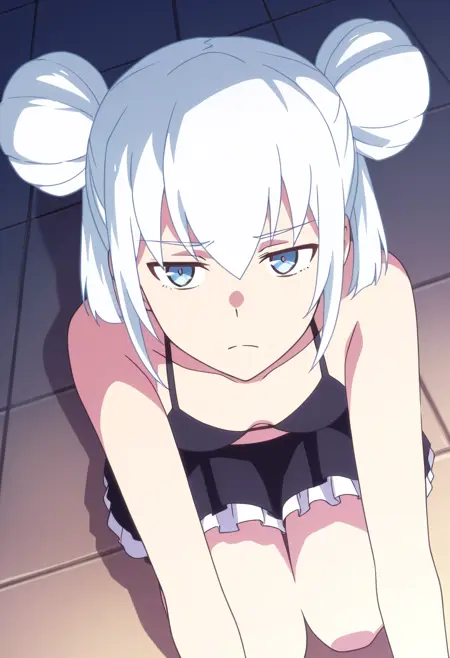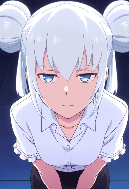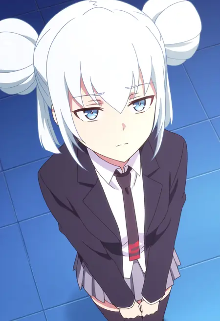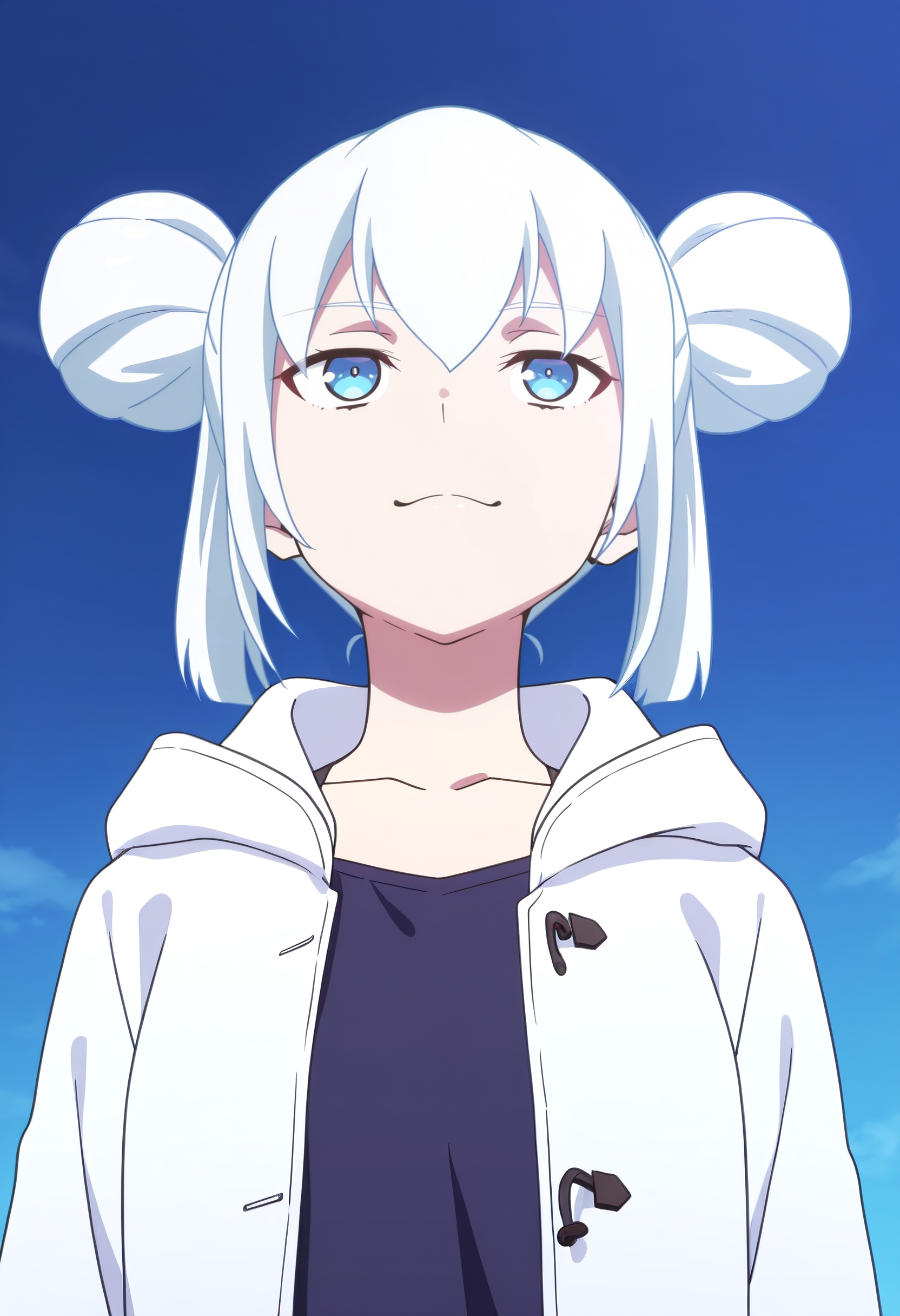 TDLXiaobei,白发,短发,刘海,蓝眼睛,双丸子头,头发下可见眉毛,头发位于眼睛之间,发髻,