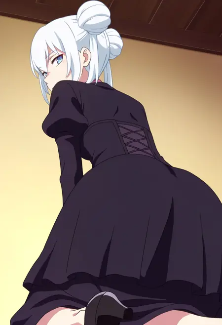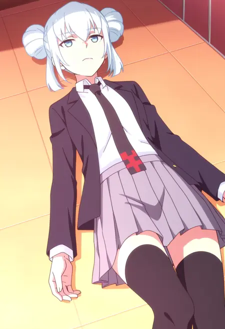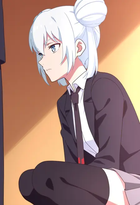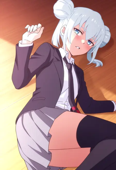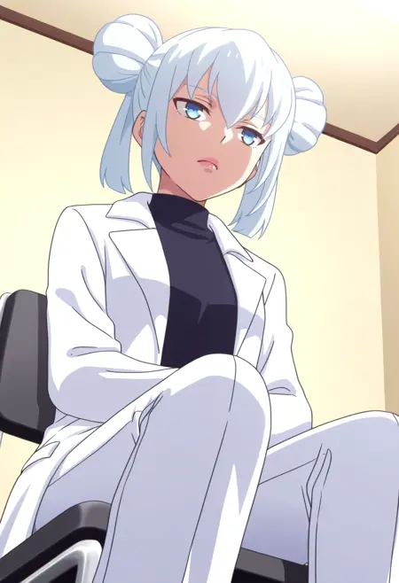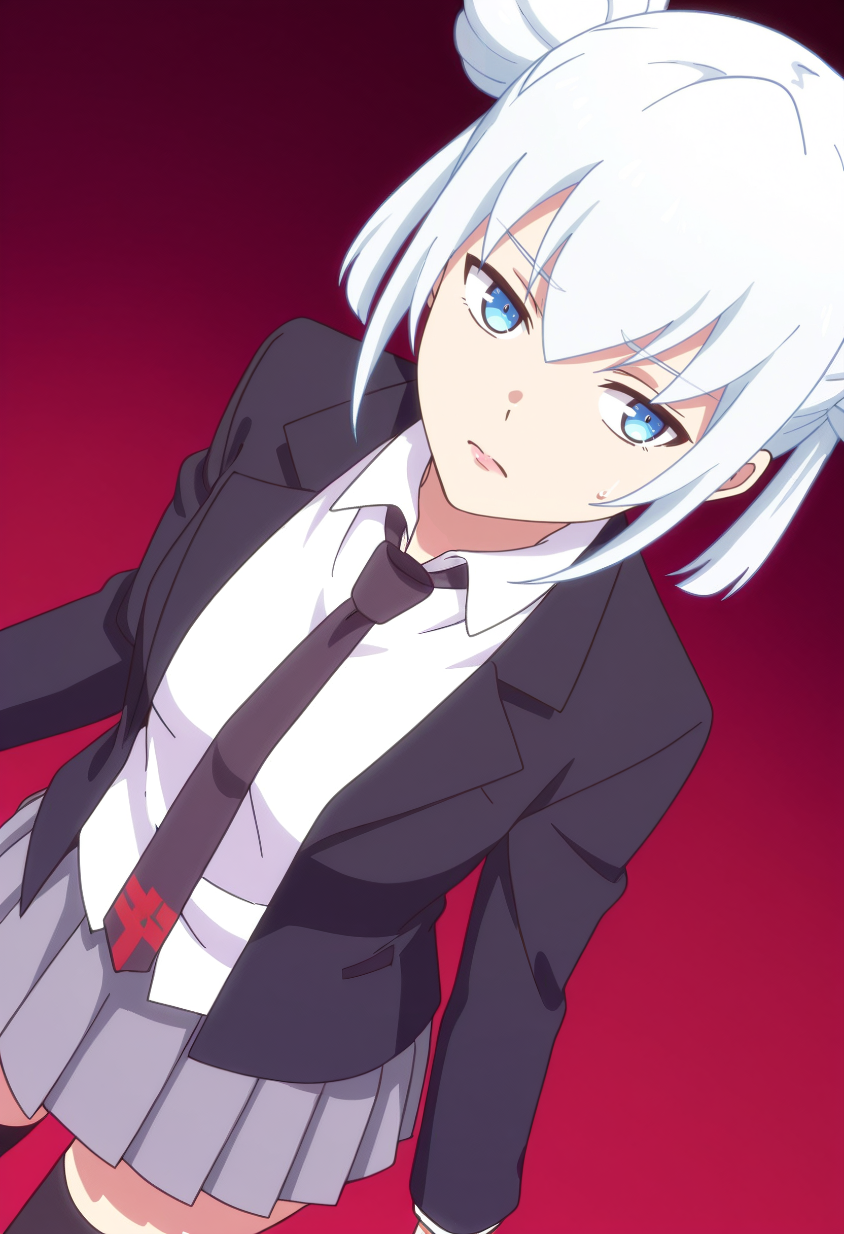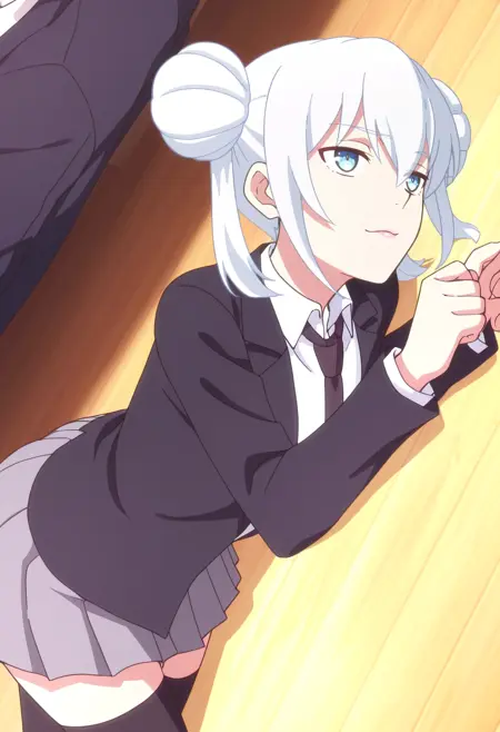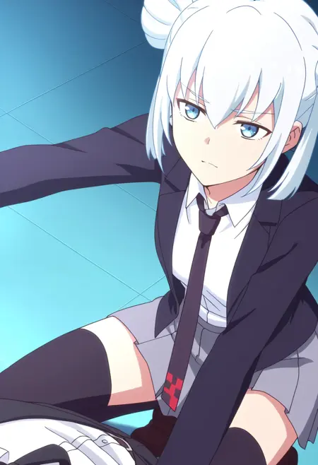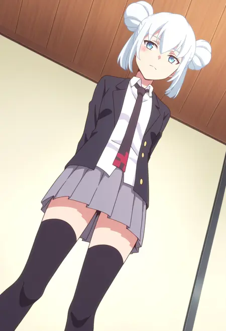 TDLXiaobei,白发,短发,刘海,蓝眼睛,双丸子头,头发下可见眉毛,头发位于眼睛之间,发髻,