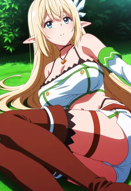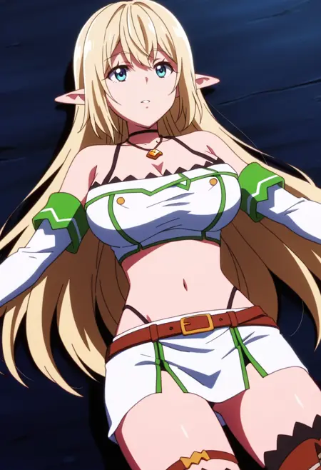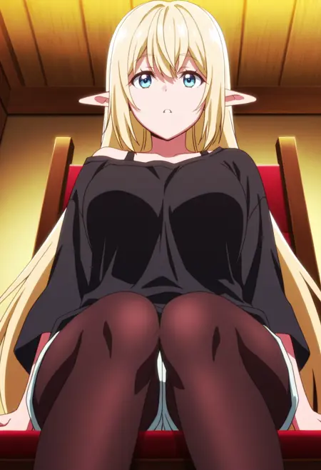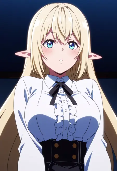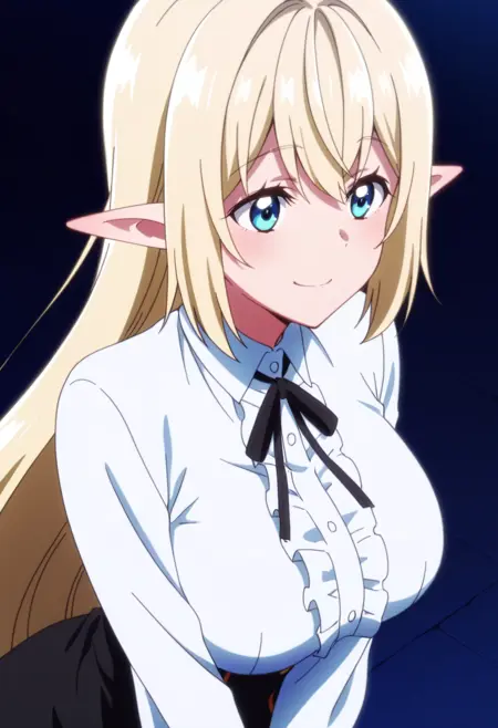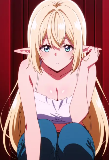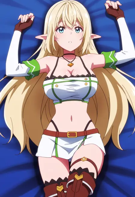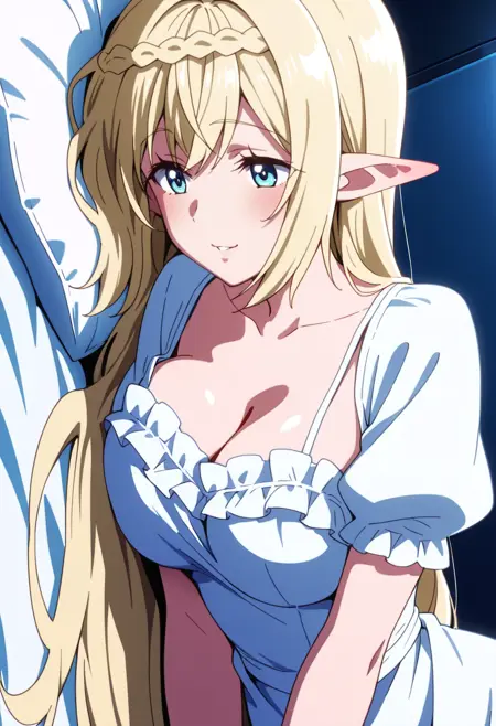 BAria, elf, long hair, blonde hair, pointy ears, blue eyes, hair between eyes, bangs, long pointy ears, very long hair, eyebrows visible through hair,