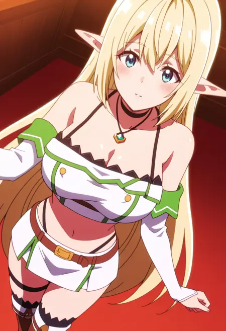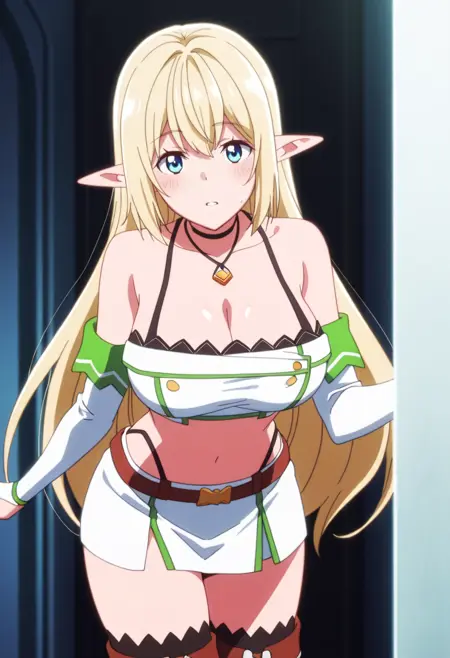 AriaAdventurer, bare shoulders, collarbone, choker, cleavage, thighhighs, jewelry, gloves, navel, detached sleeves, boots, necklace, skirt, midriff, elbow gloves, black choker, thigh boots, halterneck, thigh strap, highleg,