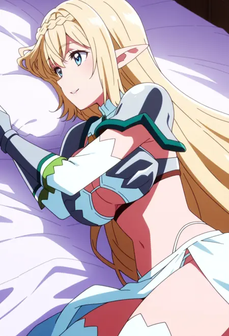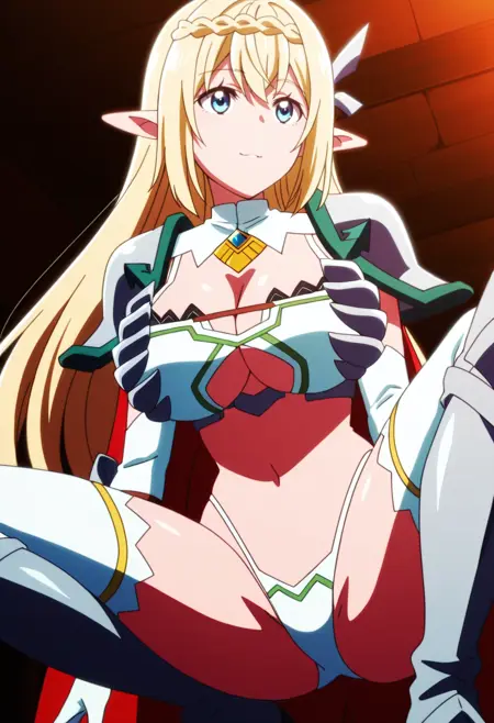 AriaArmor, cleavage, armor, braid, navel, gloves, thighhighs, bikini armor, shoulder armor, boots, ribbon, elbow gloves, white gloves, cape, crown braid, highleg, midriff, white legwear, revealing clothes,