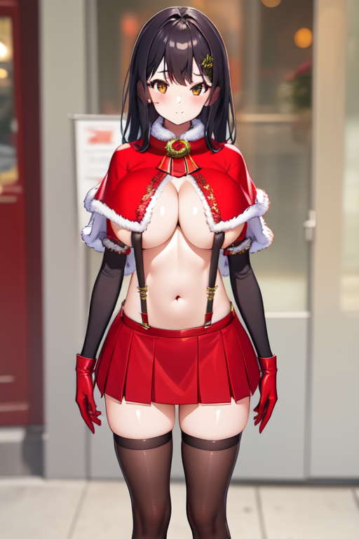 red fur-trimmed capelet, suspenders, christmas, red skirt, red fur-trimmed gloves