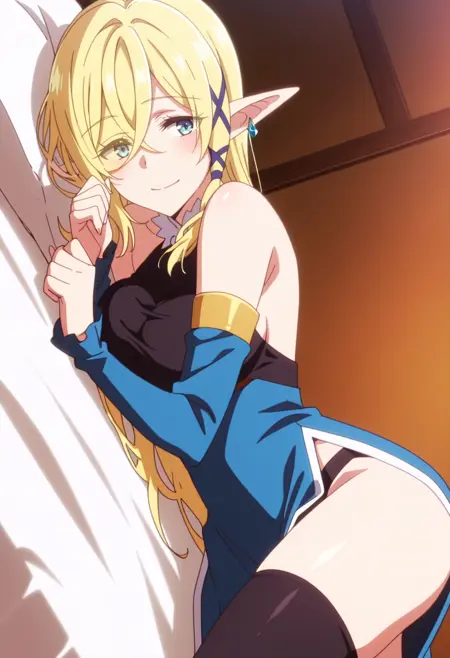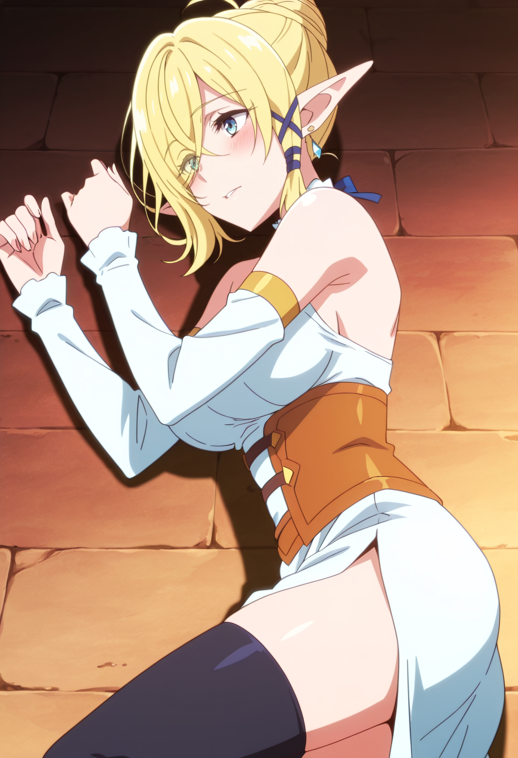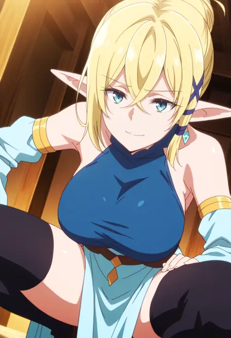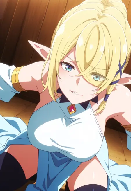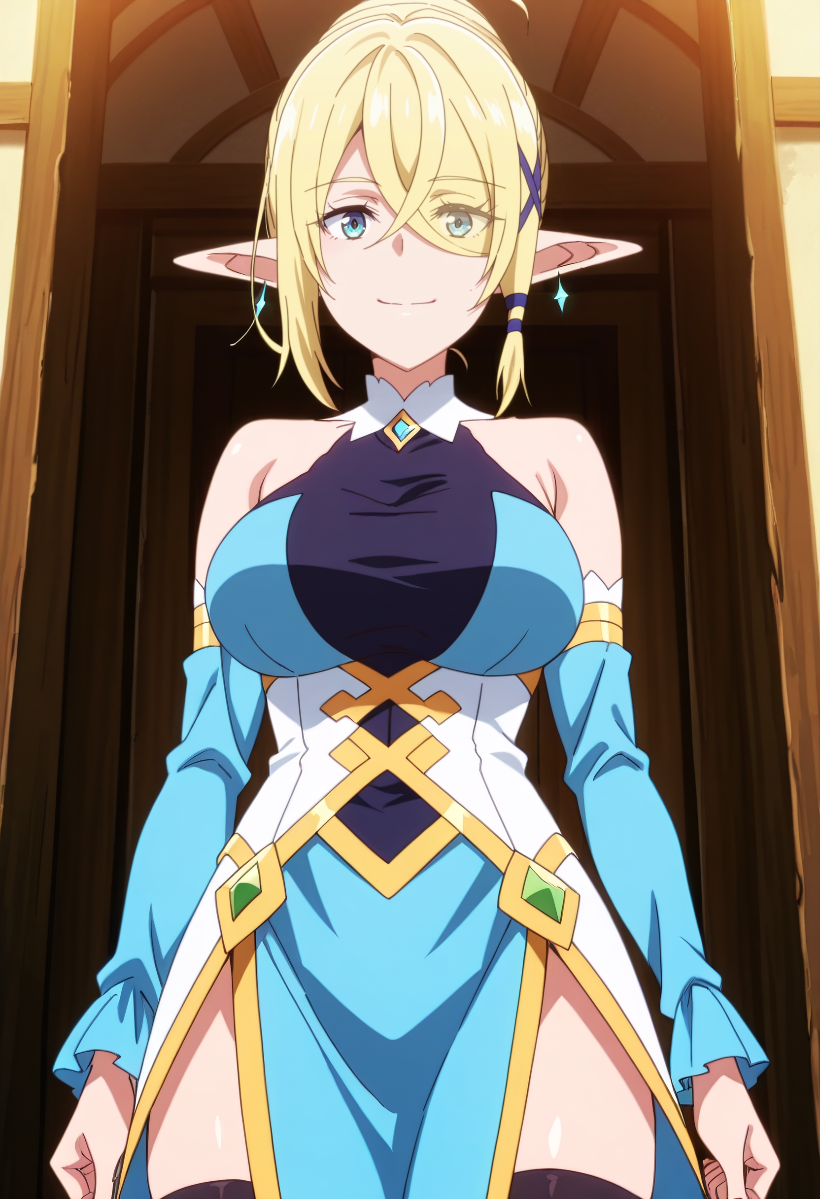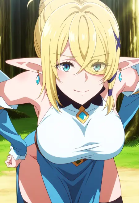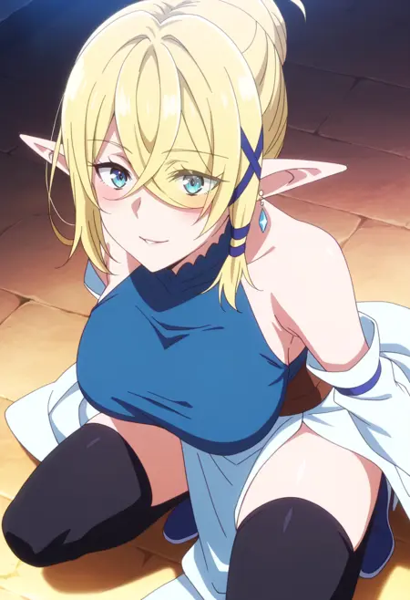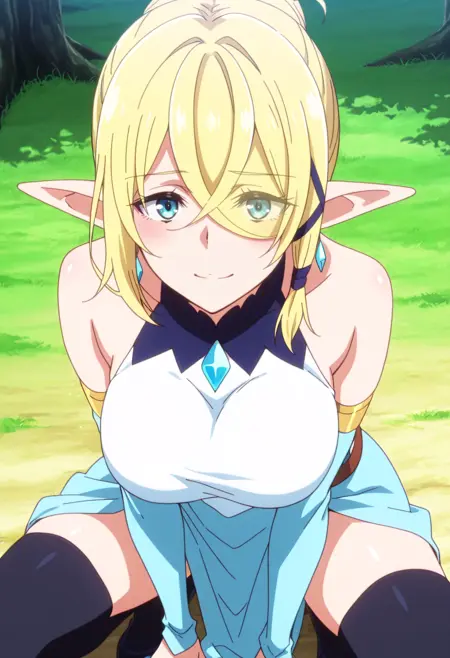 BLeona, 엘프, 뾰족한 귀, 눈 사이의 머리카락, 금발, 파란 눈, 긴 머리카락, 앞머리, 머리카락 사이로 보이는 눈썹, 긴 뾰족한 귀, 옆머리, 한쪽 눈 위의 머리카락,