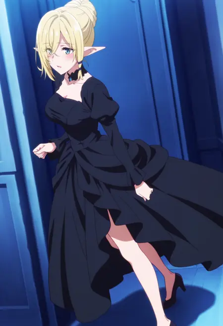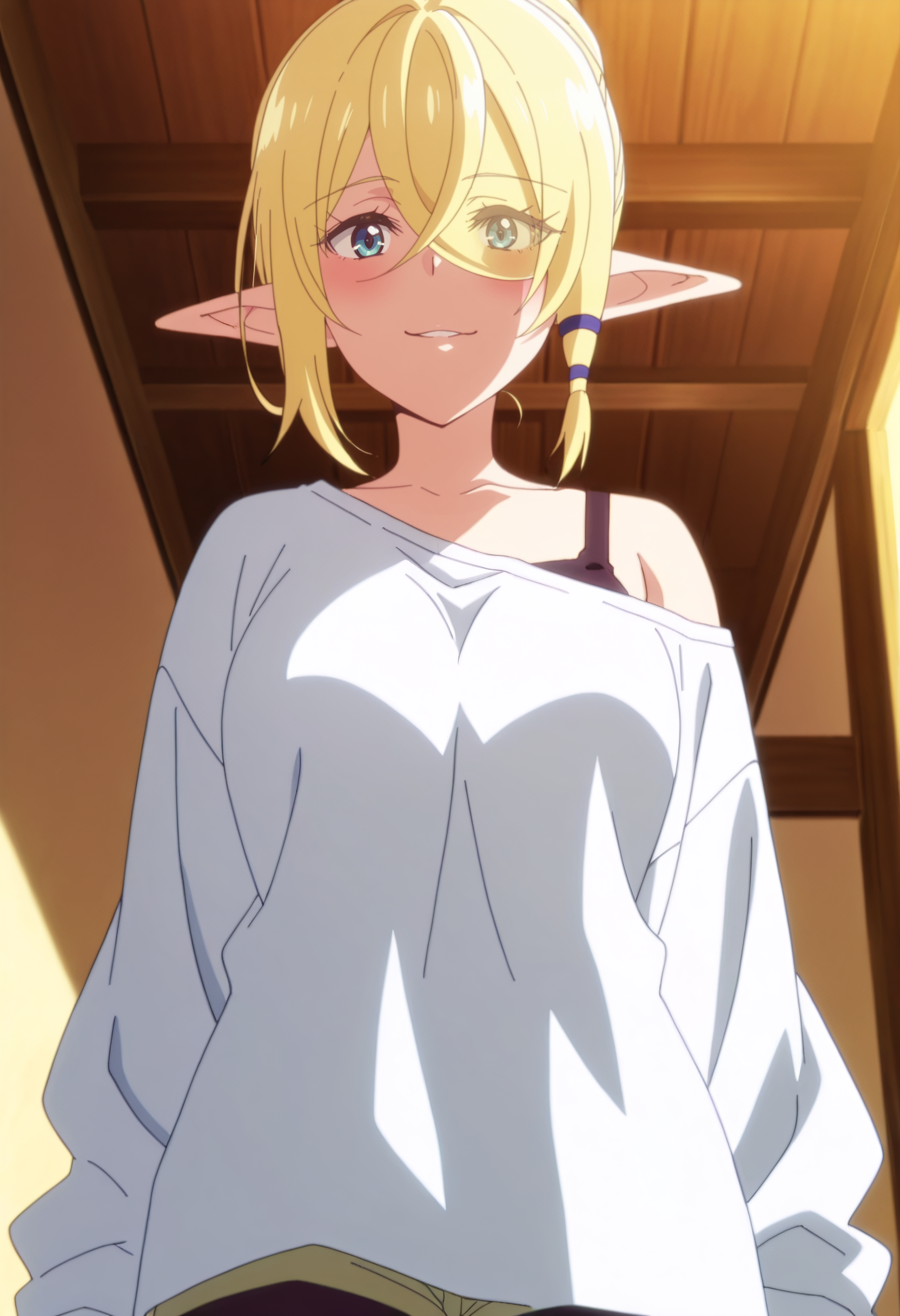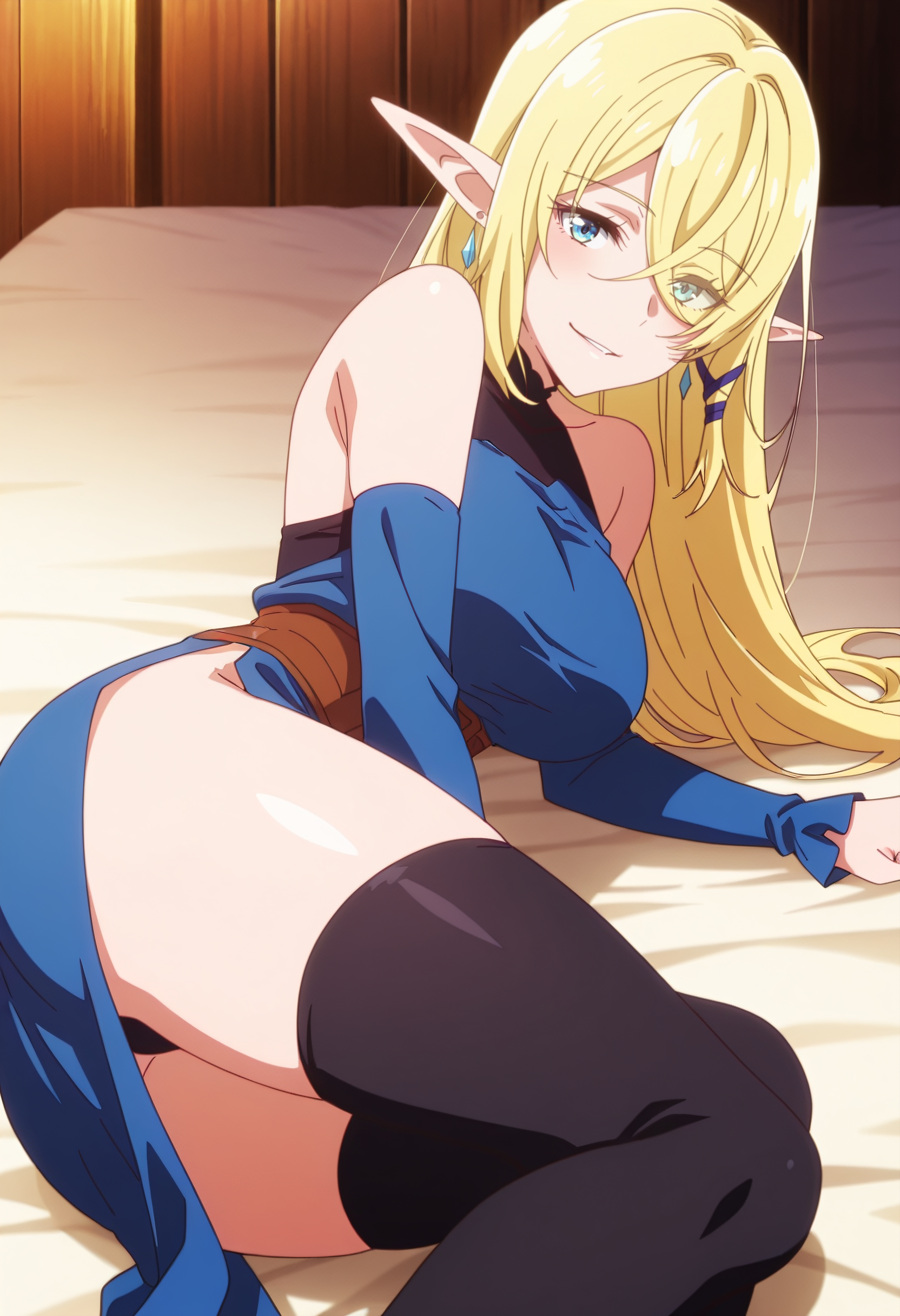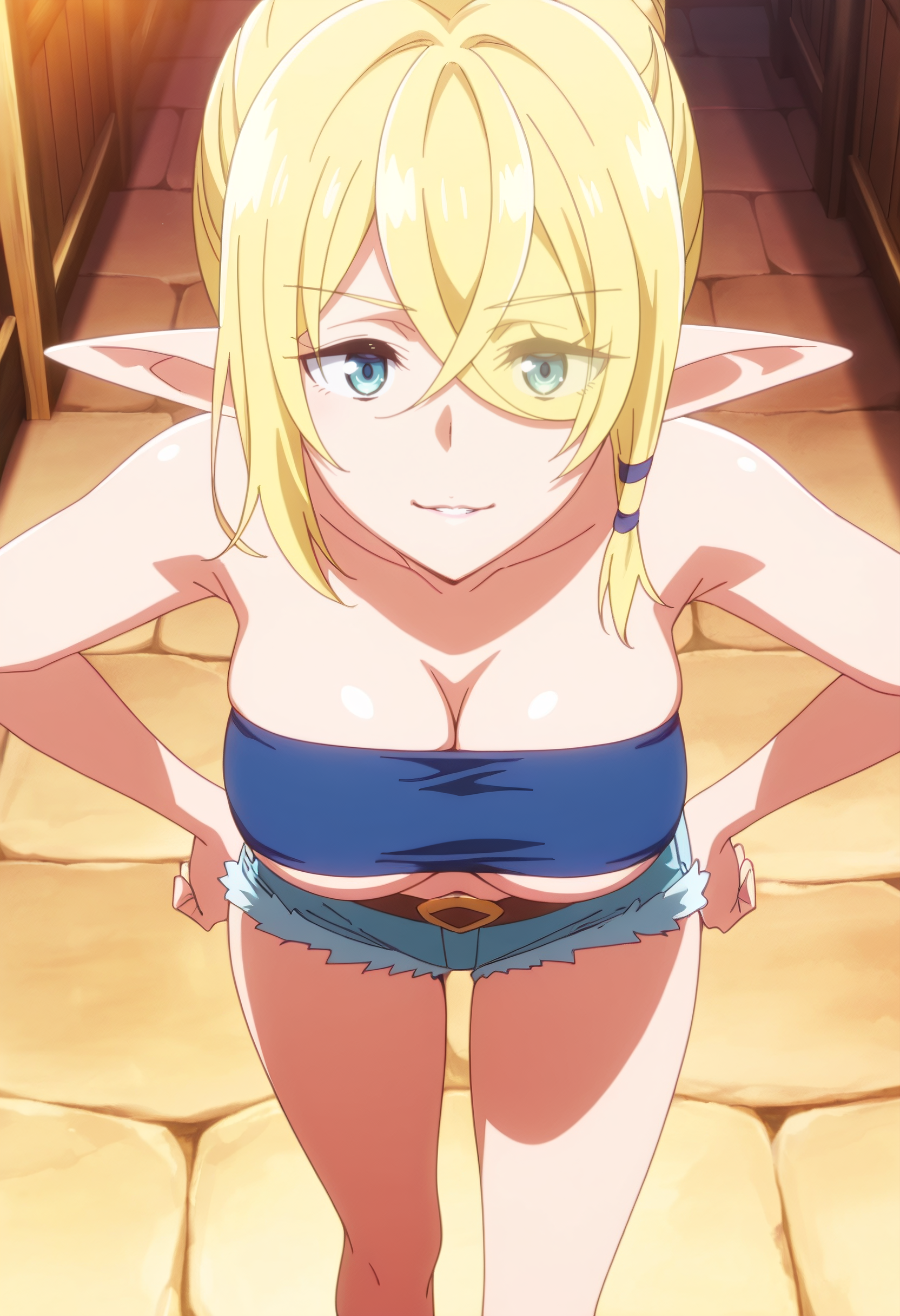 BLeona, 엘프, 뾰족한 귀, 눈 사이의 머리카락, 금발, 파란 눈, 긴 머리카락, 앞머리, 머리카락 사이로 보이는 눈썹, 긴 뾰족한 귀, 옆머리, 한쪽 눈 위의 머리카락,