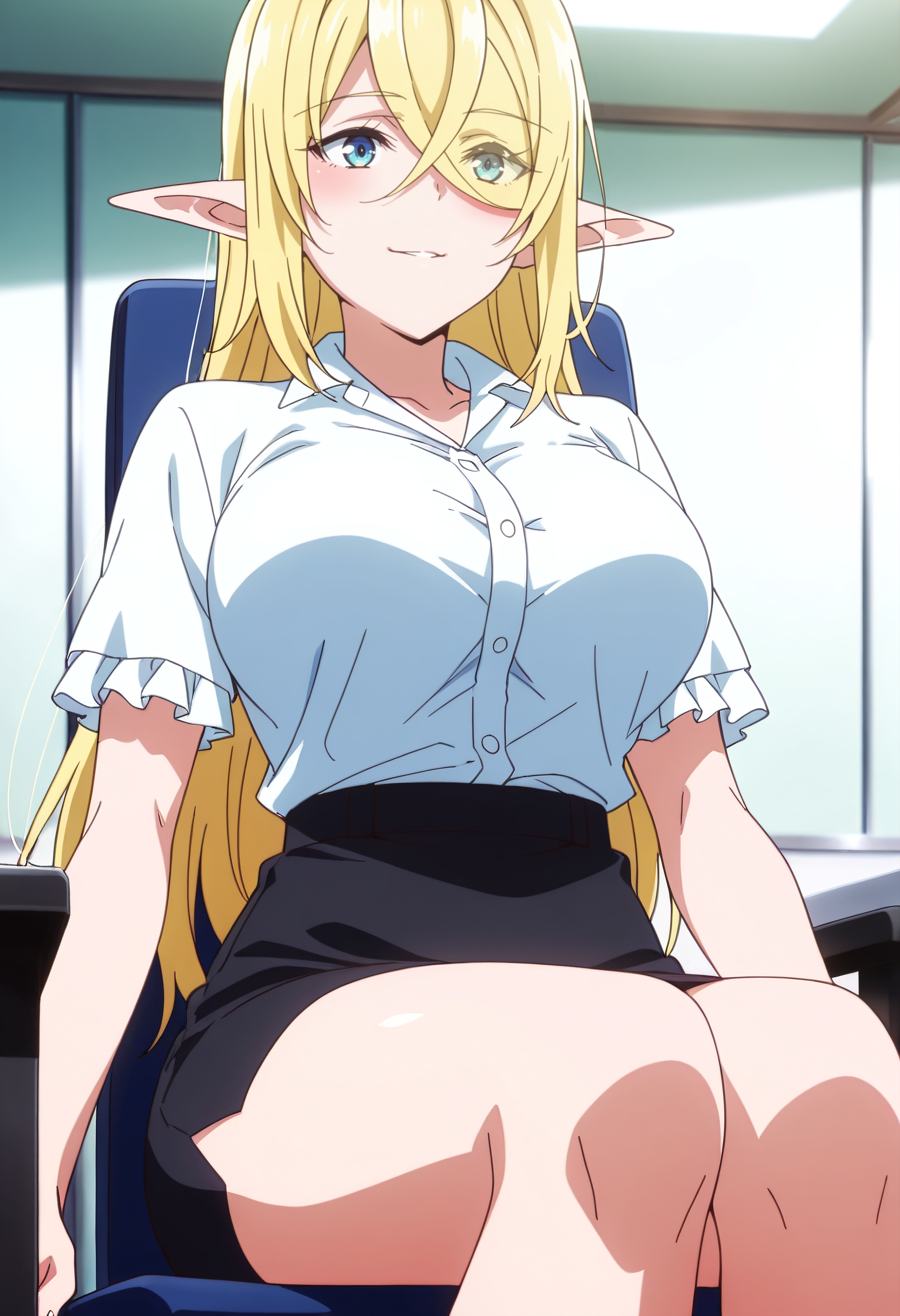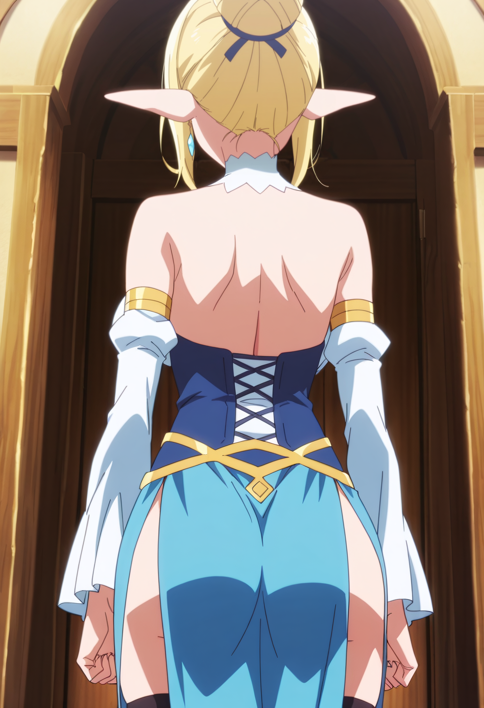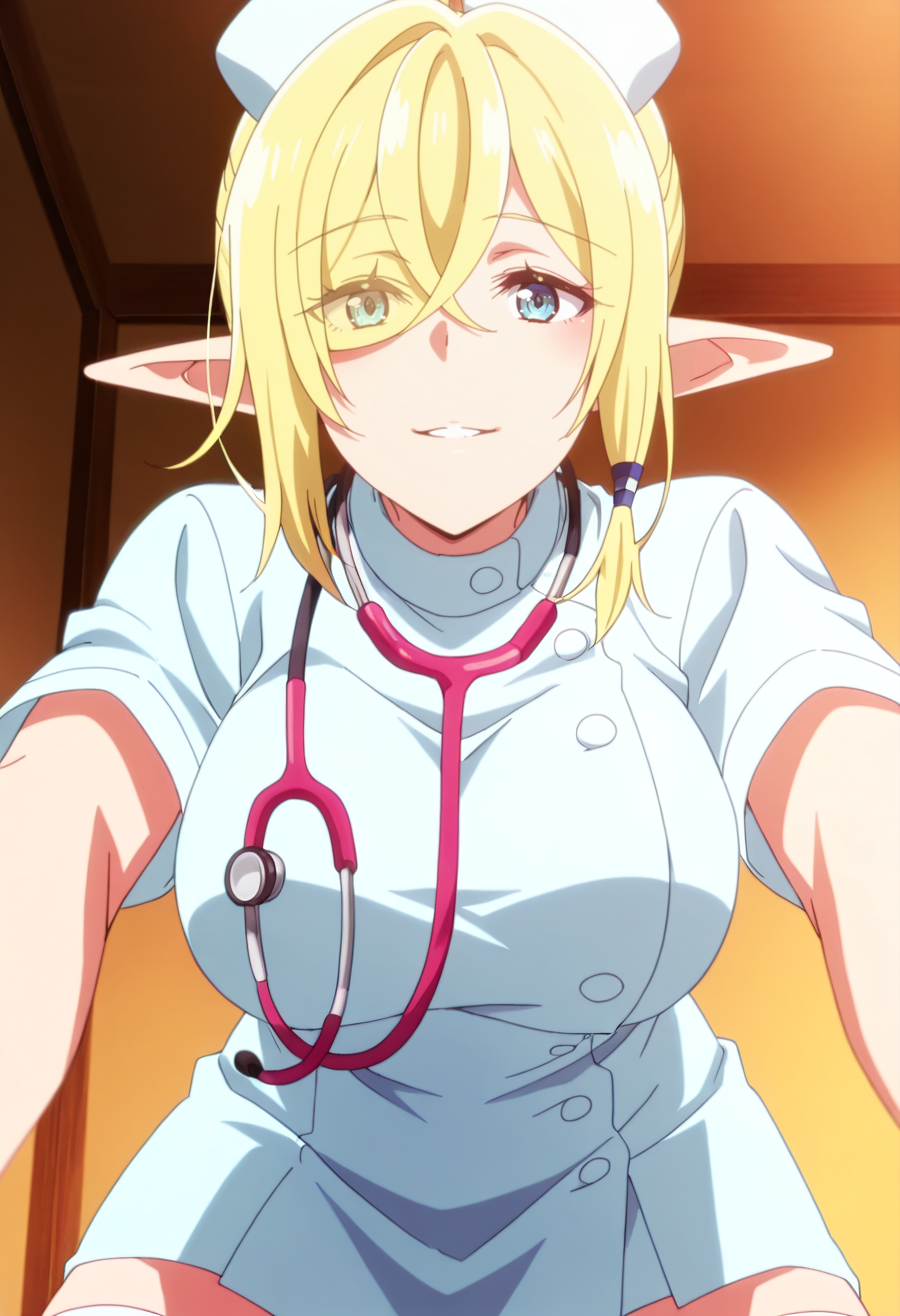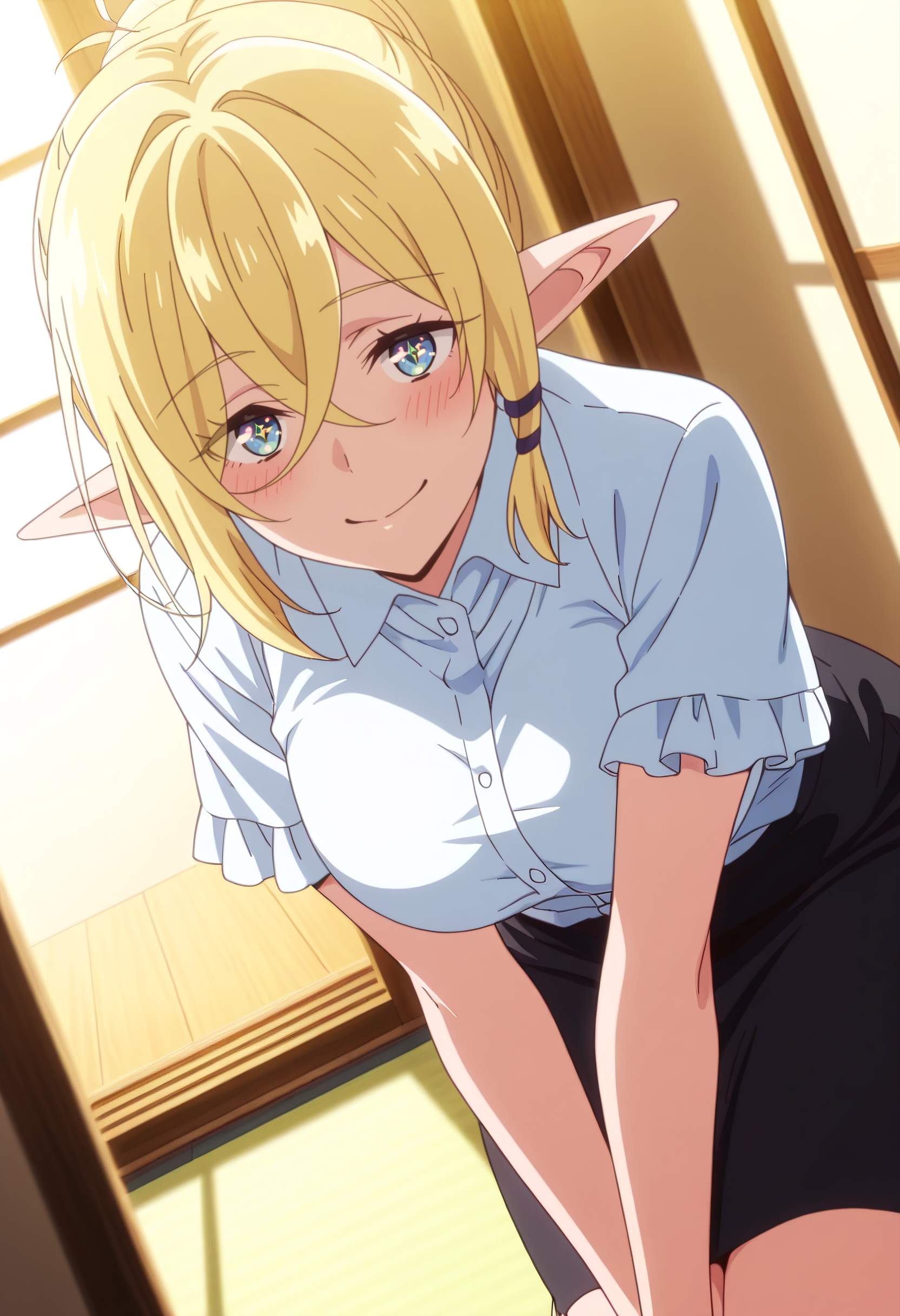 BLeona, 엘프, 뾰족한 귀, 눈 사이의 머리카락, 금발, 파란 눈, 긴 머리카락, 앞머리, 머리카락 사이로 보이는 눈썹, 긴 뾰족한 귀, 옆머리, 한쪽 눈 위의 머리카락,