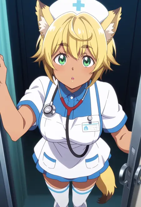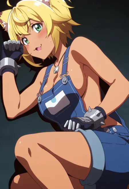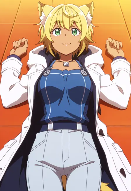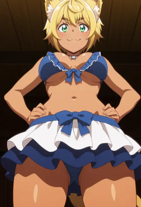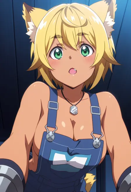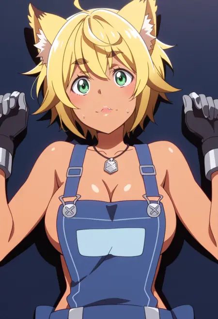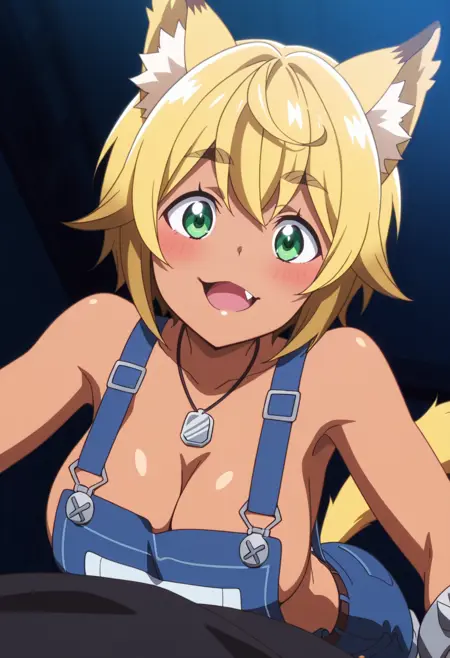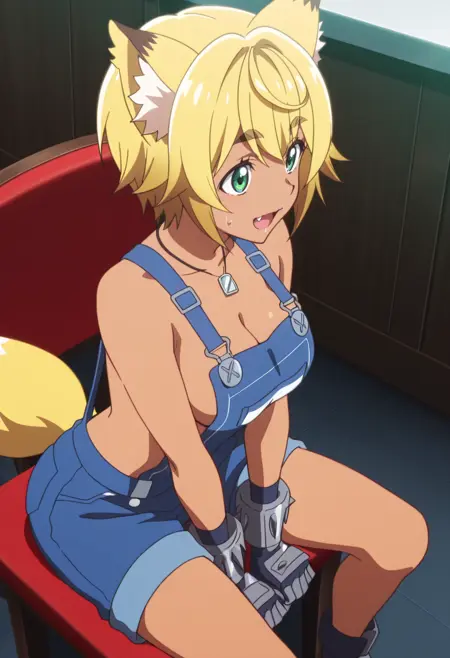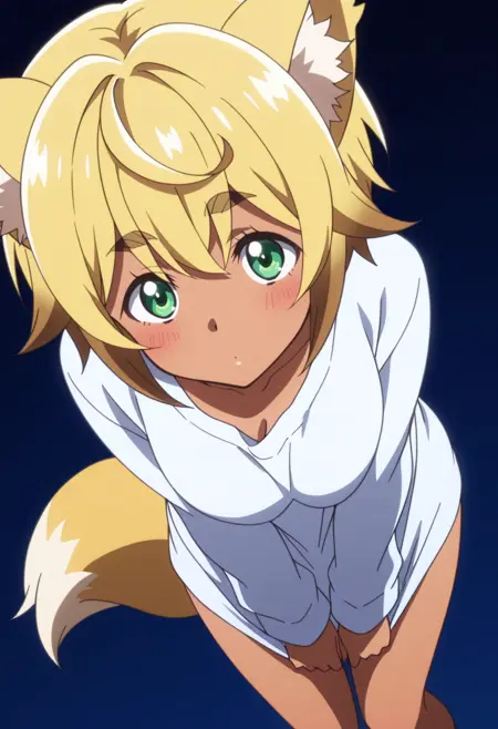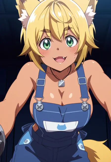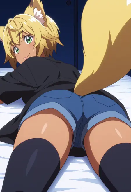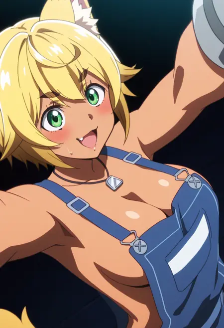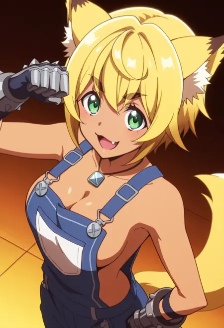 BVulcan、肌の黒い女性、金髪、短髪、動物の耳、緑の目、猫の耳、前髪、髪の間から見える眉毛、目と目の間の髪、狐の耳、動物の耳のふわふわ、尾、あほ毛、肌の黒い、