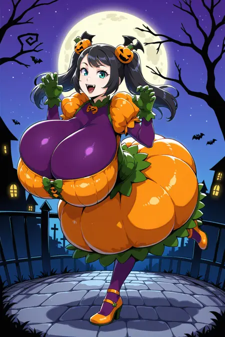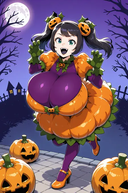 ・ハロウィン、グリーンの手袋、ふくらはぎの短い袖、カボチャのコスチューム、パープルのボディスーツ、ジャック・オー・ランタンの髪飾り、ボディスーツの下着、重ね着の袖、ロングスリーブ、オレンジのドレス、バブルスカート