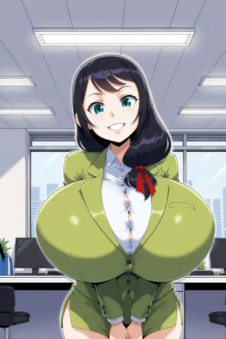 ・緑のジャケット、スーツジャケット、ドレッシーシャツ、白いシャツ、スカートスーツ、ミニスカート、ペンシルスカート、緑のスカート、サイドスリット