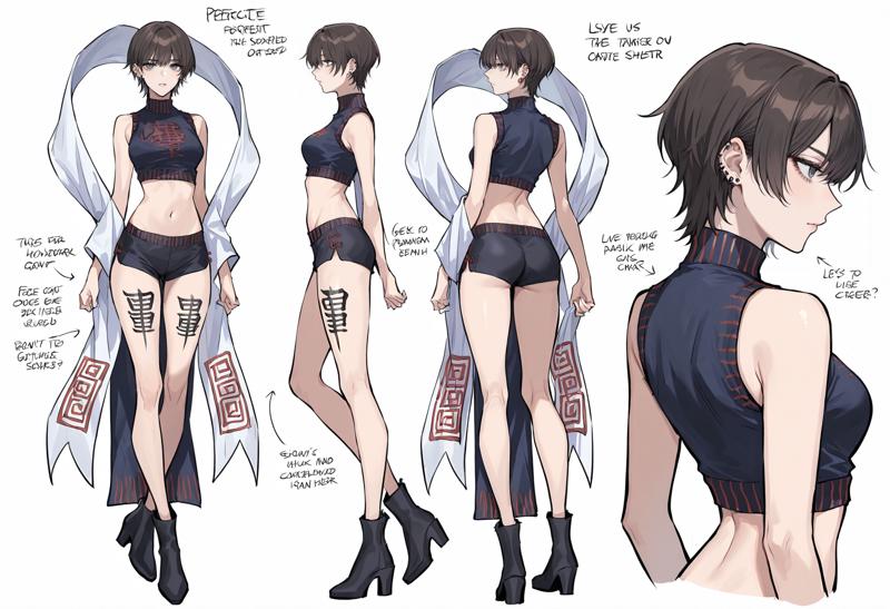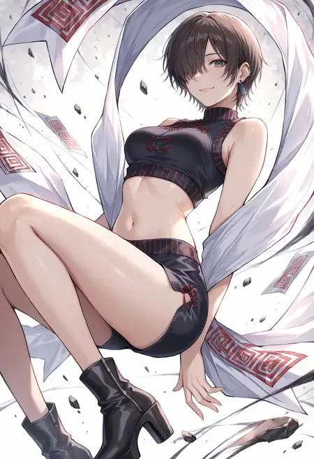 crop top,midriff,shawl,black footwear,bare shoulders,high heels,piercing,sleeveless,ofuda,jewelry,earrings,breasts,shorts,bare legs,chinese clothes,bare arms,medium breasts,black shorts,shirt,short shorts,boots,turtleneck,underwear,hagoromo,leg tattoo