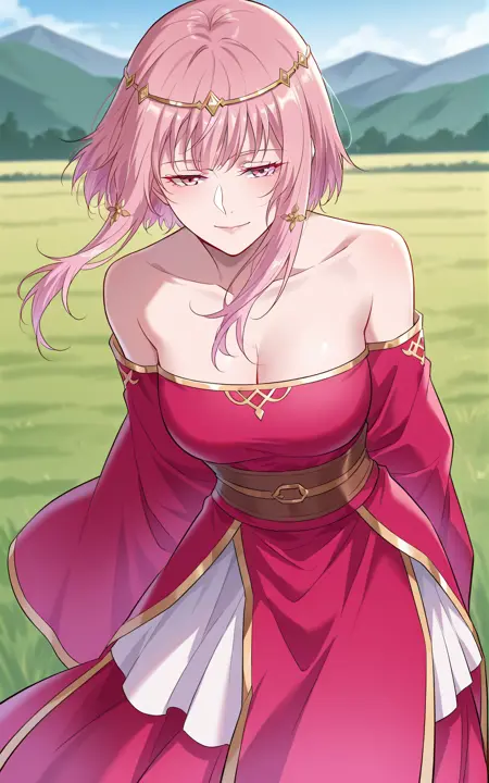 Hanliusu_복장, 자홍색 드레스 상의, 짧은 드레스, 측면 슬릿 드레스, 어깨 드러난 드레스, 스트랩리스 드레스, 드러난 어깨, collarbone, 가슴, 어깨 드러난 네크라인, 금색 테두리 네크라인, 긴 소매, 넓은 소매, 흰색 손목장식, 금색 테두리 손목장식, 흰색 안쪽 로브, 무릎 길이 안쪽 로브, 금색 테두리 안쪽 로브, 연홍색 허리 벨트, 넓은 허리 벨트, 금색 테두리 벨트, 자홍색 속치마, 긴 속치마, 자홍색 신발,