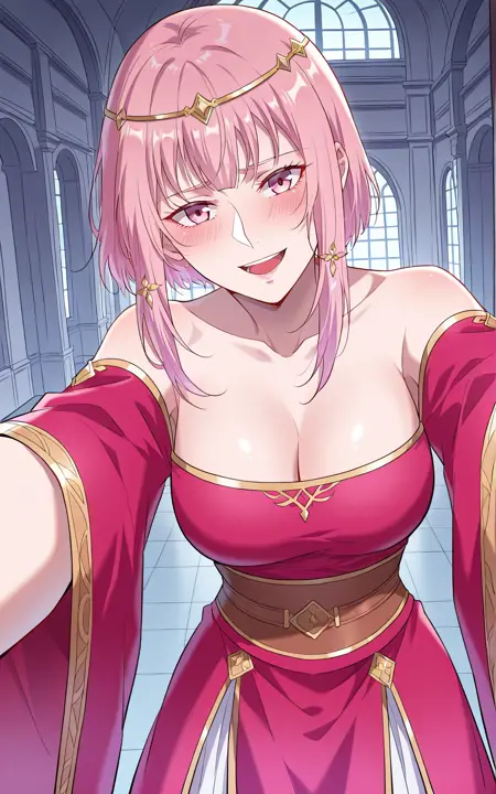 Hanliusu, 1소녀, 혼자, 분홍색 눈, 연분홍색 머리카락, 중간 길이 머리, 곧은 앞머리, 눈 사이의 머리카락, 긴 옆머리, 비대칭 머리카락, 풀린 머리카락, 금색 관모, 옆머리 장식, 금색 장식,