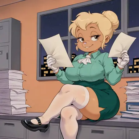 chipmunk female, solo, blonde hair, hair bun, brown eyes, pink nose, tan fur, chubby, big breasts, white gloves, large dark green skirt, green collared shirt with long sleeves, white ascot, white stockings, black strap shoes,