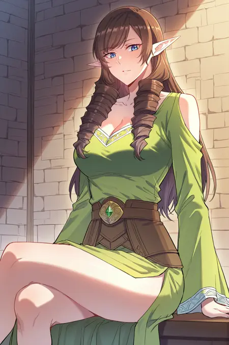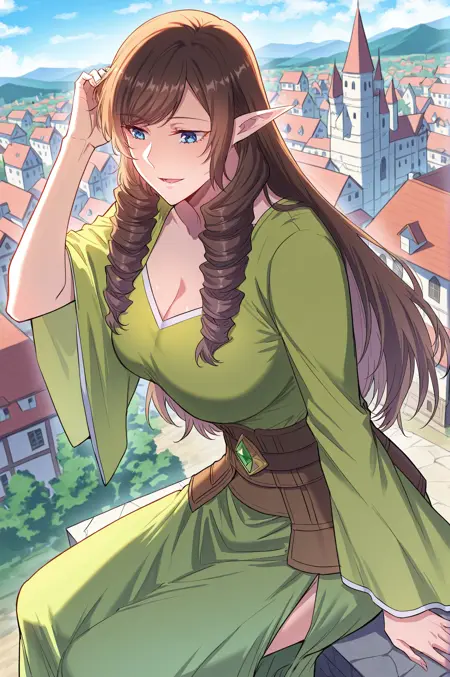 Yingapo、1 girl、単体、青い目、茶色の髪、長い髪、サイドスイープの前髪、目の間に髪、長いサイドロックス、ツインドリル、カールしたサイドロックス、尖った耳、