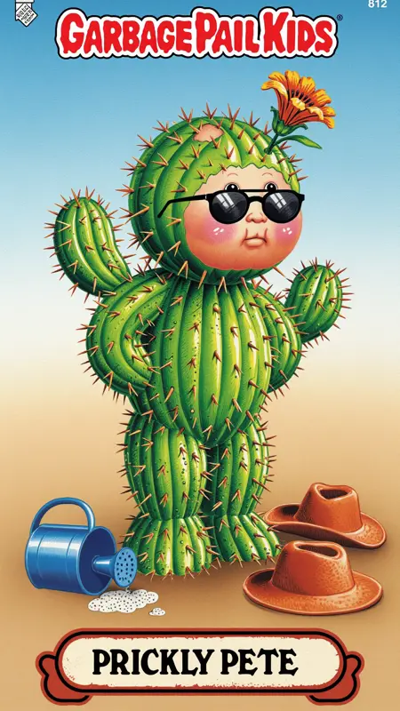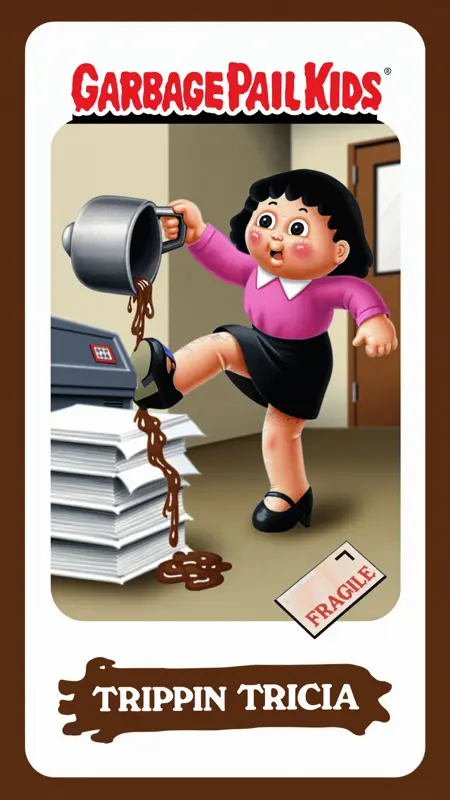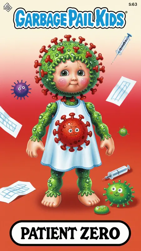 各ステッカーカードには、ゴミ袋キッズのキャラクターが、ユーモラスな_言葉遊び_(https://en.wikipedia.org/wiki/Word_play)で命名された、奇妙な異常や変形、あるいは恐ろしく痛ましい運命・死を経験している様子が描かれている。例:_Adam Bomb_ や Blasted Billy。