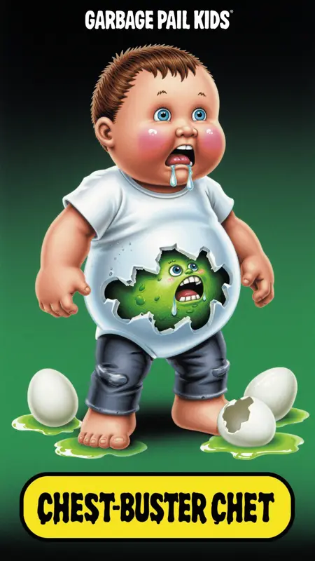 このカードには、寄生する宇宙生物をパロディ化した、不気味な子供キャラクター「Chest-Buster Chet」が描かれている。子供の腹部は不気味に膨らんでおり、透き通っており、その中には小さな鋭い歯を持ったヌルヌルした二次的な生物が、外に突き出そうと奮闘している。キャラクターは誇張されたカートゥーン風の特徴で描かれ、ショックと苦痛の表情を浮かべ、口からよだれが滴っている。子供は、腹部が裂けたTシャツを着ている。背景はヌルヌルした濃い緑からインクのような黒へのグラデーションで、割れた卵やネバネバした透明なよだれのしずくが散らばっている。カードは、Garbage Pail Kidsの特徴的な太く明確な輪郭線と、ツヤのある不自然な色を使用している。「GARBAGE PAIL KIDS」のロゴは上部にあり、「CHEST-BUSTER CHET」は下部の滴る酸性黄色のバナーに記されている。