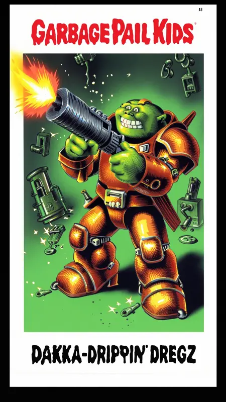 このカードには、サイボーグ警察官をパロディ化した、不気味な子供キャラクター「Robo-Slob」が描かれている。子供の顔と胸の半分は錆びた機械部品で、露出した配線が見え、もう半分は滴るような青あざだらけの顔で、腐ったベビーフードを食べている。キャラクターは誇張されたカートゥーン風の特徴で描かれ、輝く赤いビジョンアイと、泥を垂らしながら曲がった水鉄砲になった銃の腕を備えている。子供は破れた汚れたおむつを履いており、その上に警察のバッジステッカーが貼られている。背景は工業的なグレーから不健康な肌色へのグラデーションで、壊れたおもちゃの車や粉砕された犯罪現場テープが散らばっている。カードは、Garbage Pail Kidsの特徴的な太く明確な輪郭線と、汚れた金属色を使用している。「GARBAGE PAIL KIDS」のロゴは上部にあり、「ROBO-SLOB」は下部の錆びた鋼鉄のバナーに記されている。