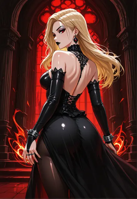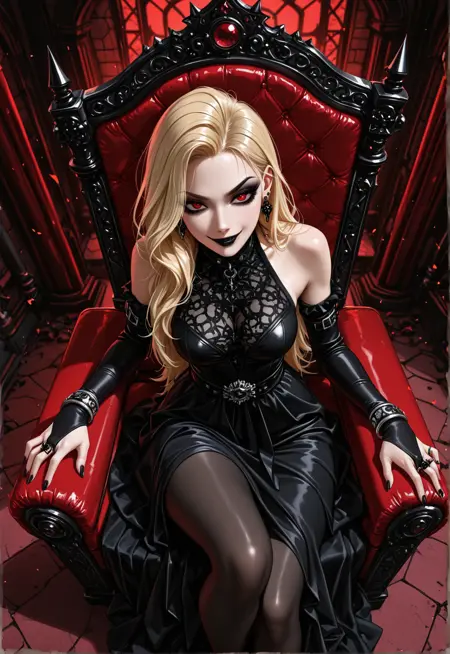CarlettaF, long hair, blonde hair, earrings, eyeshadow, red eyes, black lipstick, goth fashion, bare shoulders, medium breasts, black dress, detached sleeves, bridal gauntlets, bracelet, ring, black pantyhose, black footwear, high heel boots,