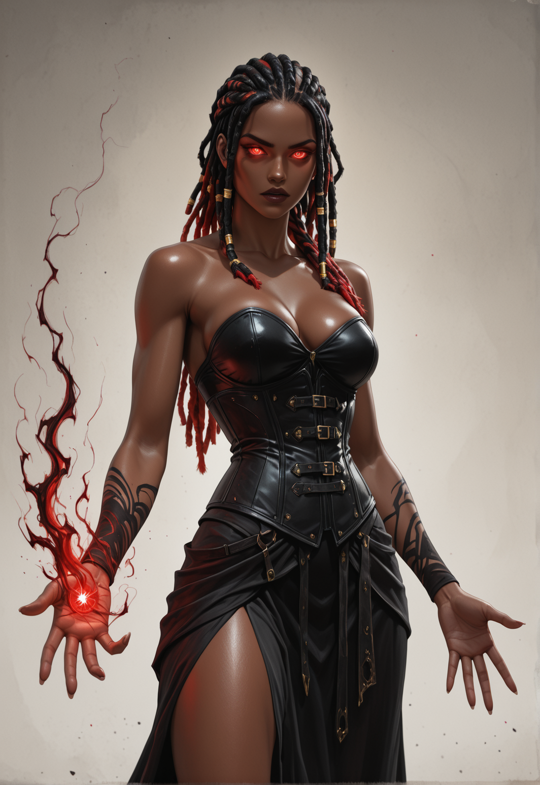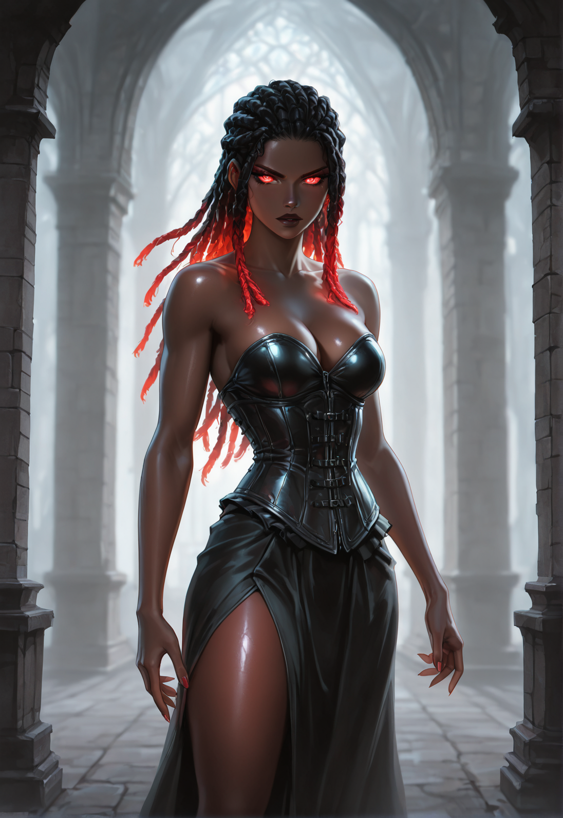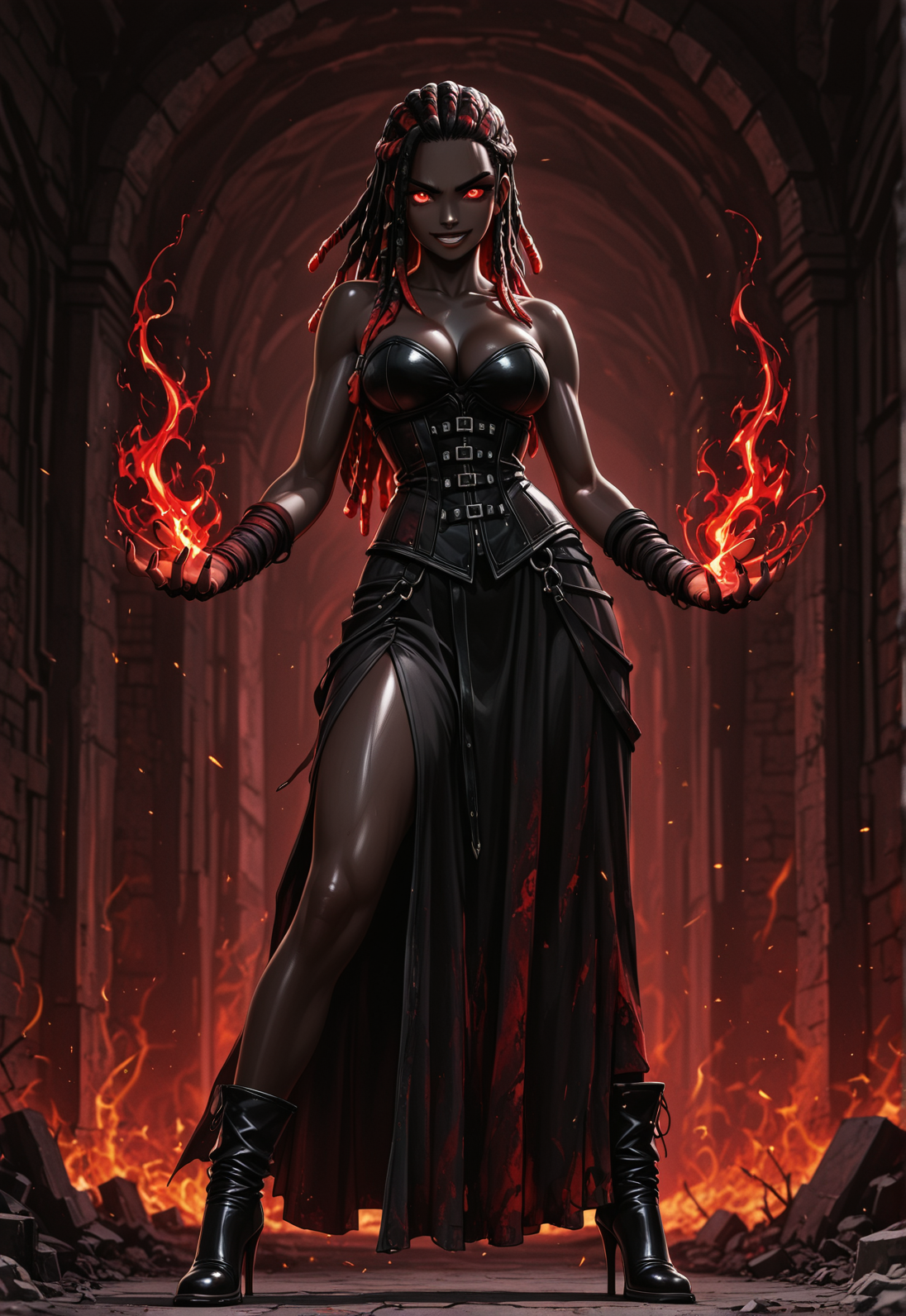 DemonikEira, dark-skinned female, dreadlocks, long hair, multicolored hair, black hair, red hair, braid, red eyes, glowing eyes, bare shoulders, strapless, cleavage, medium breasts, corset, fingerless glowes, fingernails, skirt, black footwear, high heel boots,