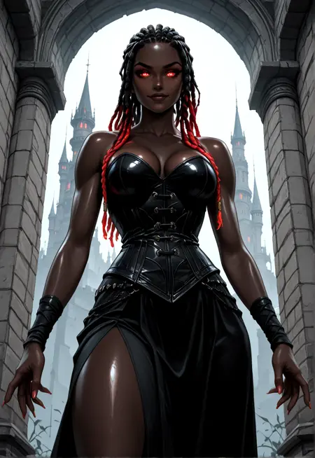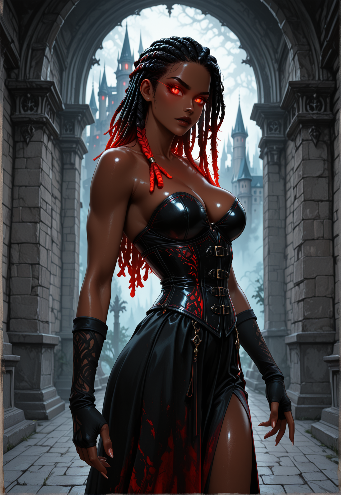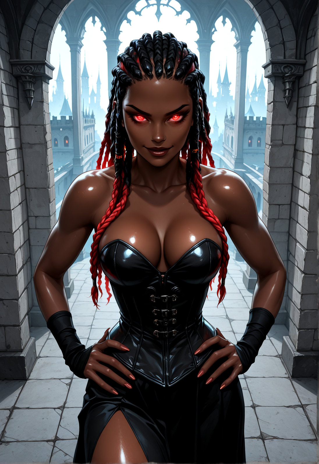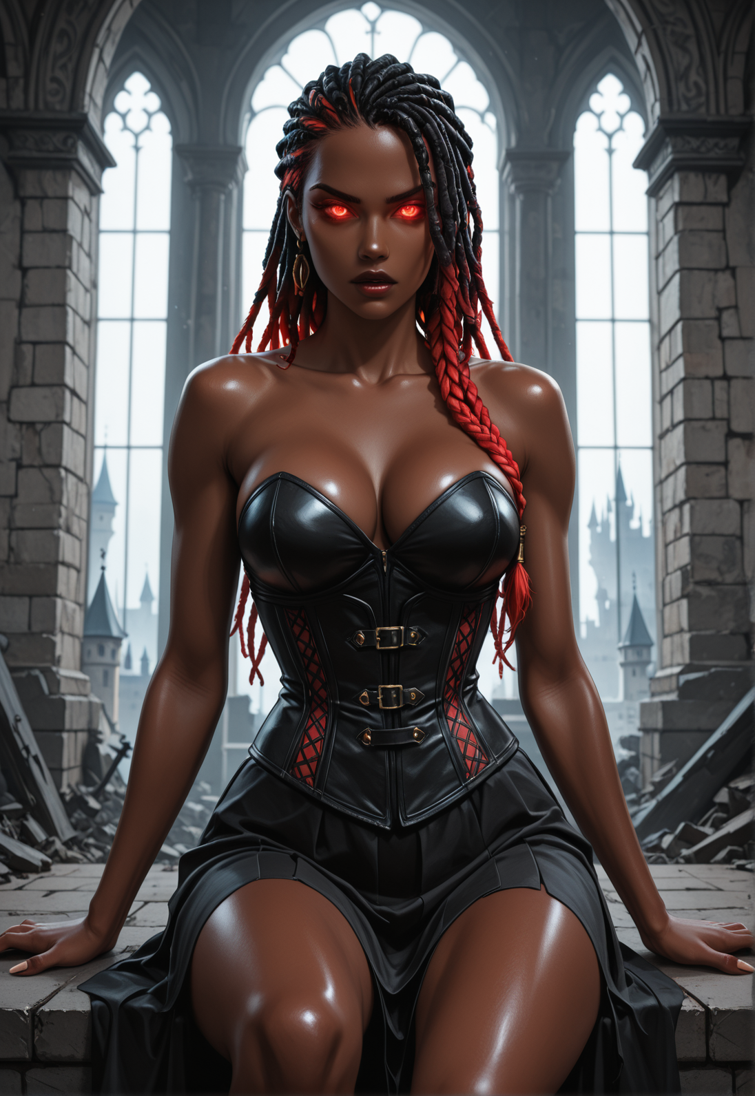 DemonikEira, dark-skinned female, dreadlocks, long hair, multicolored hair, black hair, red hair, braid, red eyes, glowing eyes, bare shoulders, strapless, cleavage, medium breasts, corset, fingerless glowes, fingernails, skirt, black footwear, high heel boots,
