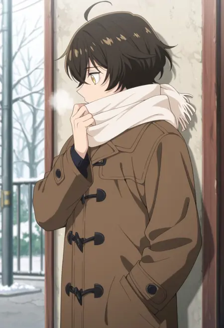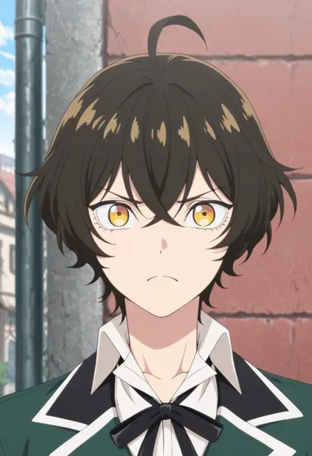 1男孩,男性焦点,单独,黄眼睛,棕发,白衬衫,锁骨,短袖,棕色短裤,及踝靴,黑色鞋履,