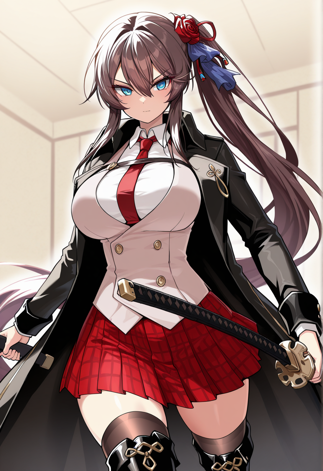 chifuyu(counterside),chifuyu_nomal,棕色头发,蓝色眼睛,马尾,外套,衬衫,背心,领带,白色手套,百褶裙,过膝袜,大腿靴,