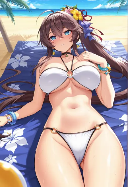 chifuyu(counterside),chifuyu_sw,棕色头发,蓝色眼睛,马尾,呆毛,黄色发花,耳环,项圈,O型比基尼,白色比基尼,丝带,珠宝,手链