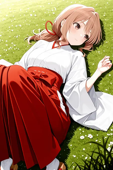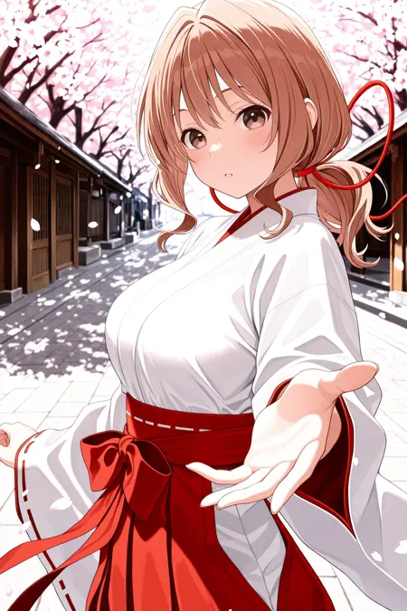 miko, japanese clothes, light brown hair, red ribbon, wide sleeves, tabi, geta, red hakama, red ribbon, obi