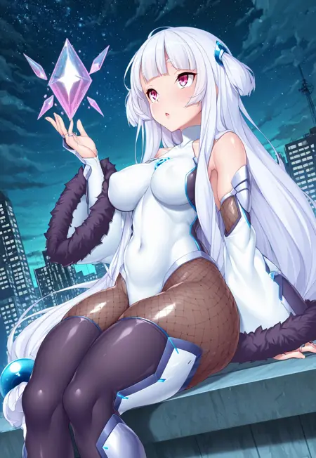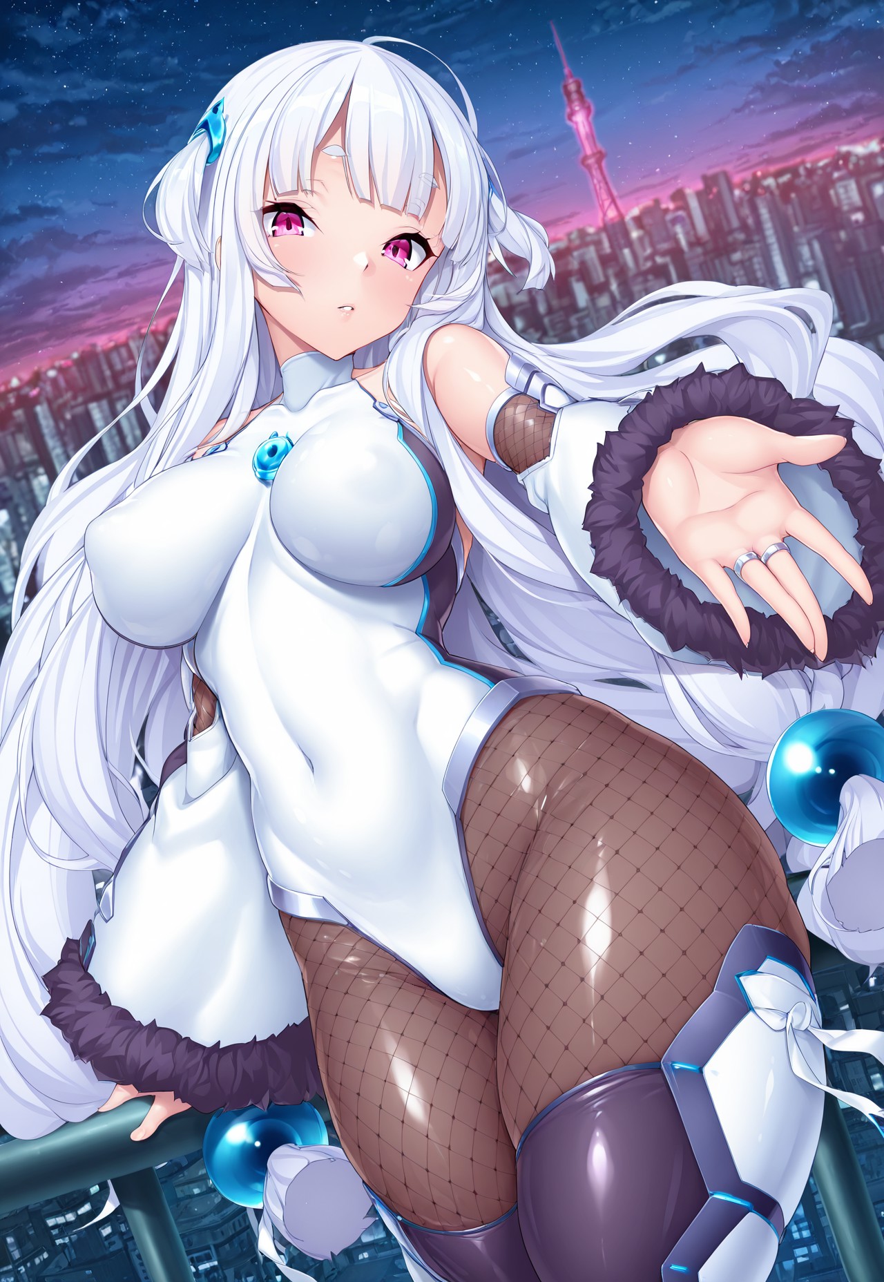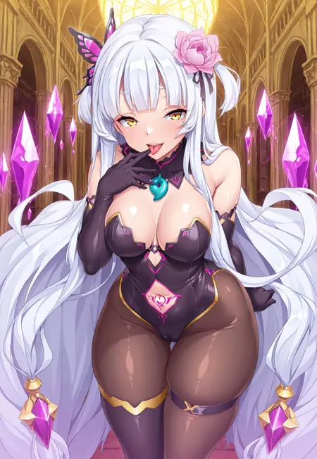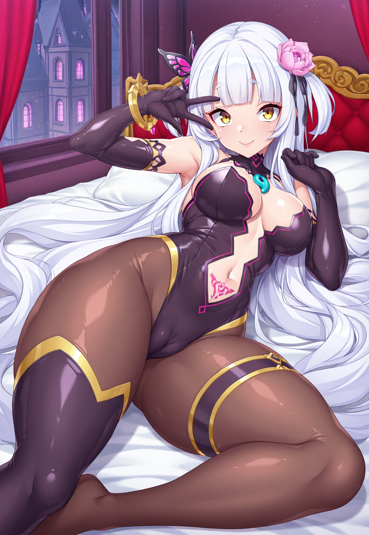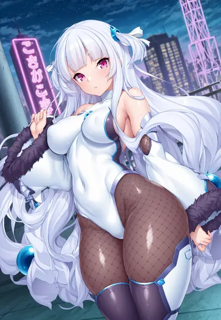 Tags: 1girl, shiny skin, curvy, nanase mai, white hair, very long hair, parted bangs, sidelocks, blunt bangs, hair ornament, short eyebrows, pink eyes, medium breasts, wide hips, thick thighs