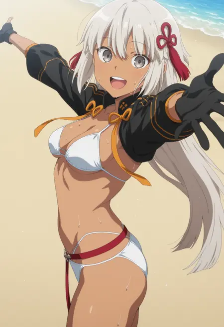 Swimsuit1: 긴 머리카락, 회색 머리카락, 회색 눈, 검은 피부, 검은 리본, 머리 장식, 흰 비키니, 검은 크롭 재킷, 주황색 리본, 부분적으로 손가락이 드러난 장갑, 빨간 벨트