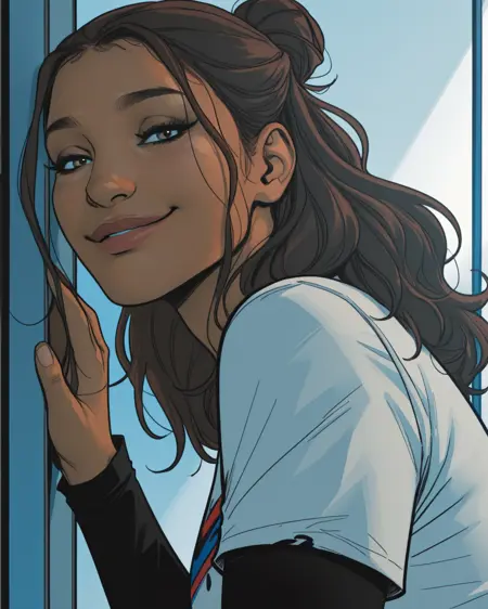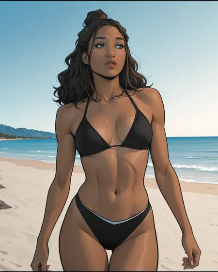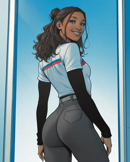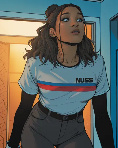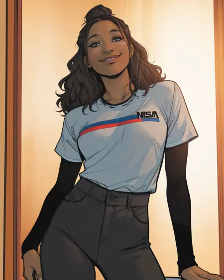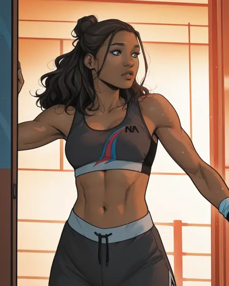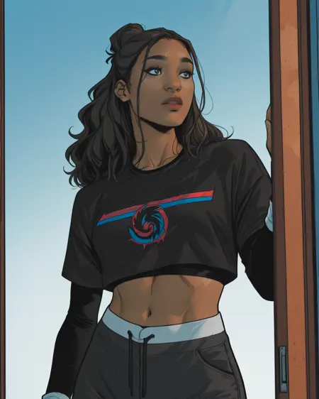 Out of armor: infernogirlred, dark-skinned female, long hair, single hair bun, short over long sleeves, layered sleeves, pants