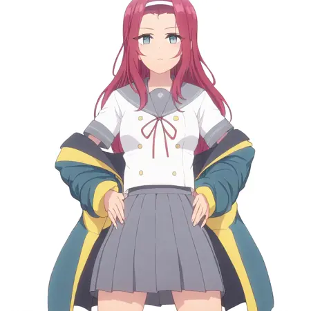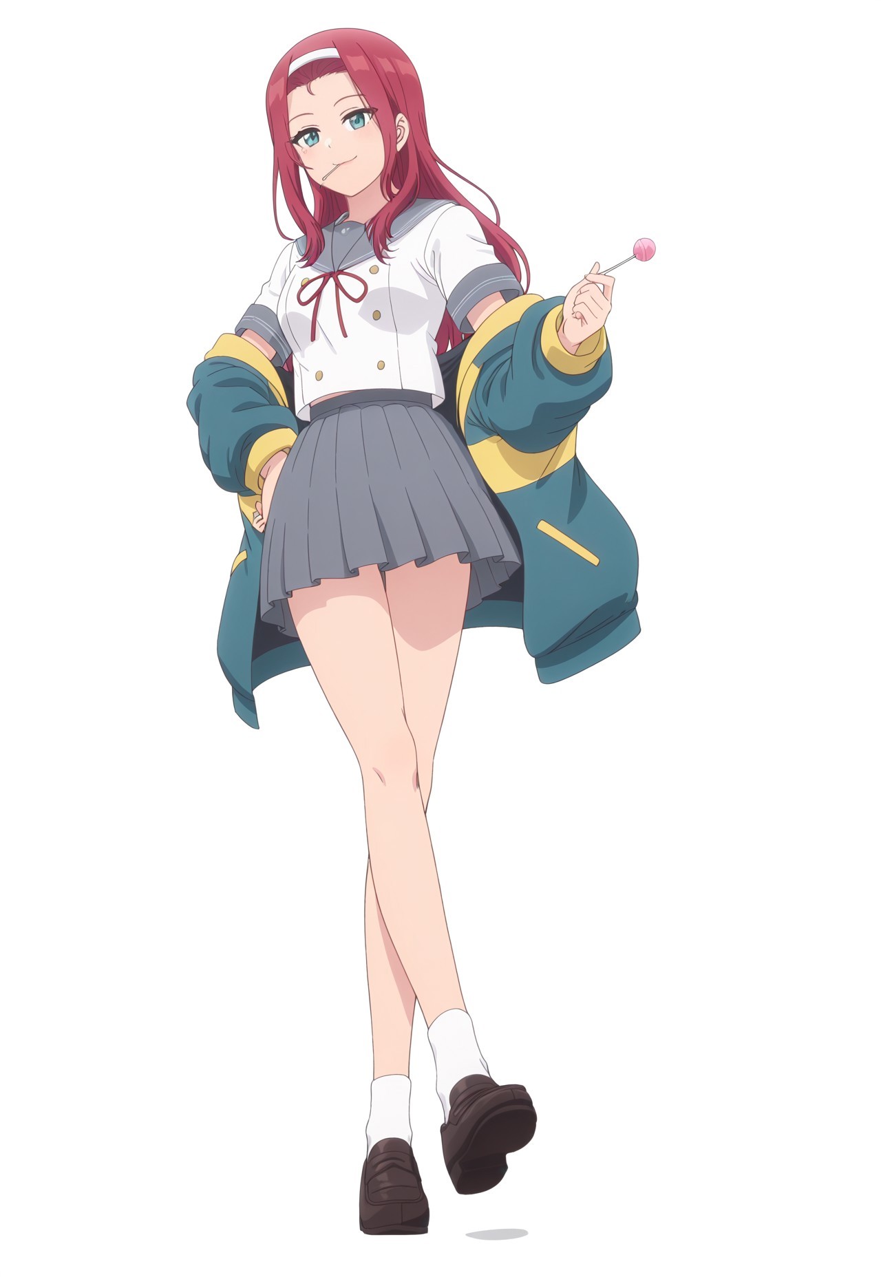 服装一: Otoi_POP,白色背景, Otoi_y, 红发,发带,青绿色眼睛,右眼下有痣,水手服制服,红色领结,灰色百褶裙, oversized 黄色点缀夹克,夹克滑落肩部,