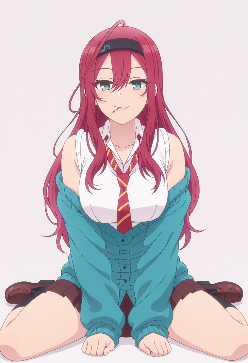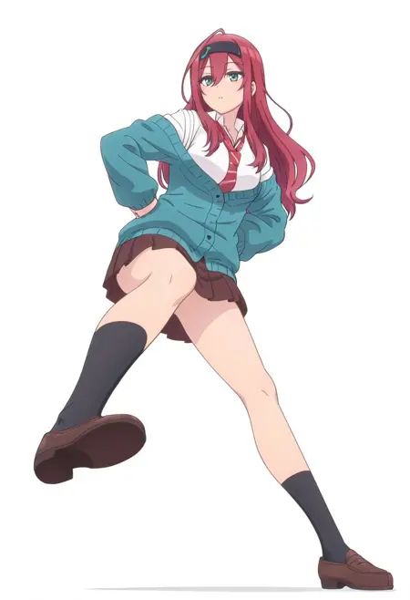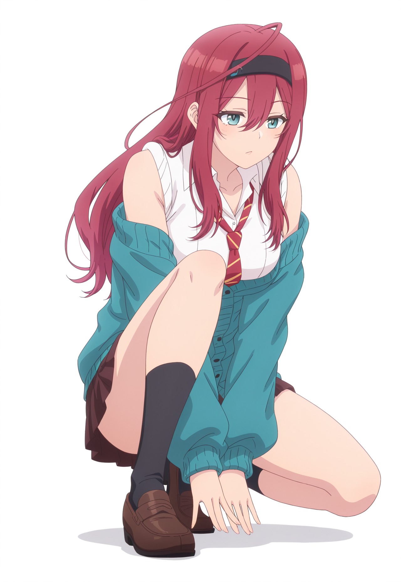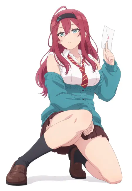 服装二: Otoi_POP,白色背景, Otoi_a, 红发,发带,呆毛,青绿色眼睛,右眼下有痣,黑色发带,发带上贴有便条,白色衬衫,松散领带,露肩针织开衫,青绿色针织开衫,棕色校裙,黑色袜子,棕色乐福鞋,低角度,全身,目光